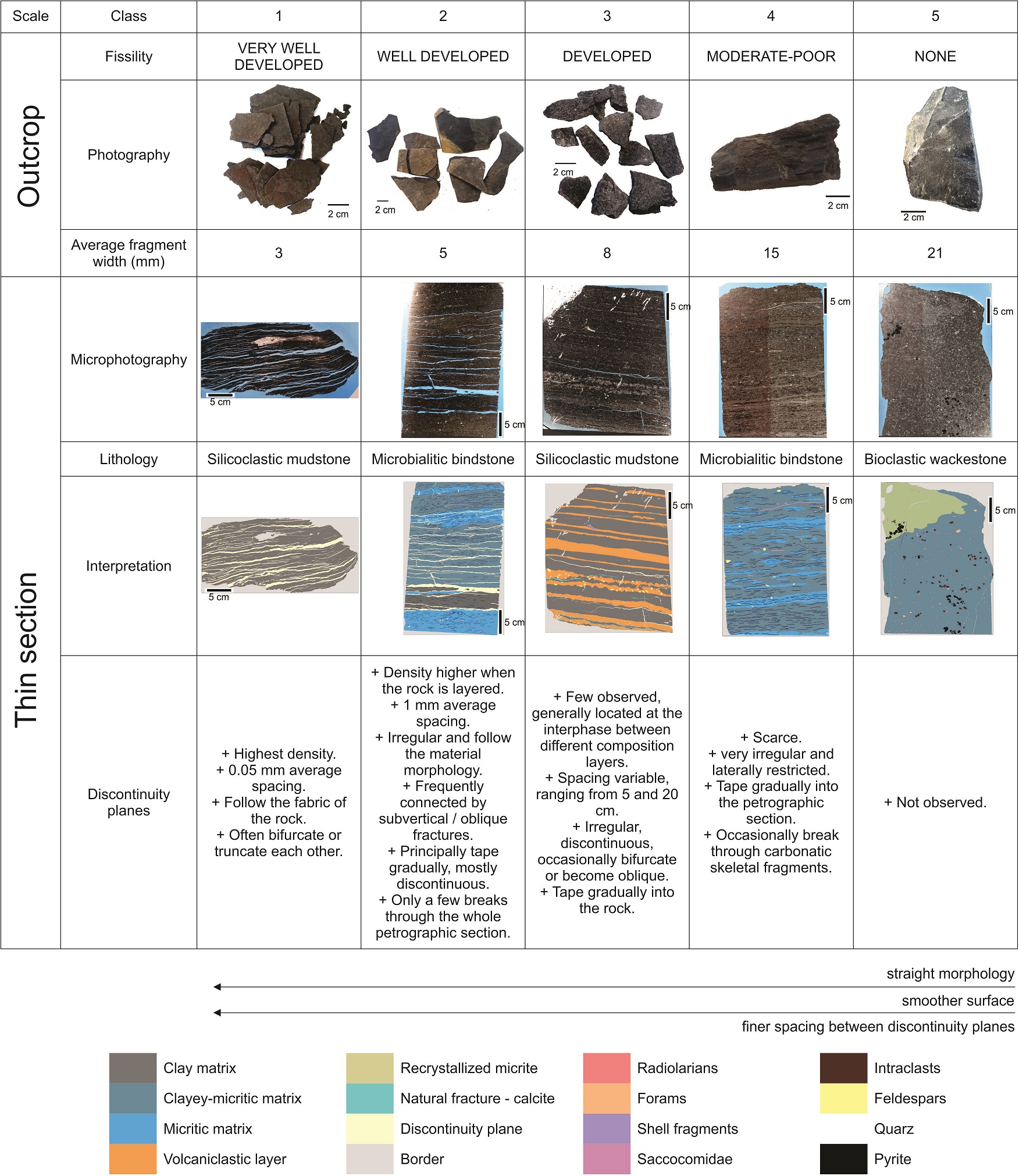 FIG 8. Visual fissility classification based on O’Brien (1970) displaying the main characteristics for each class at outcrop and microscope scales. Note that the spacing between horizontal discontinuities (interpreted as fissility planes) becomes narrower towards the first class (very well-developed fissility) while the massive samples (class 5, none fissility) lack horizontal discontinuities. The samples corresponding to the very well developed fissility class present discontinuities that often truncate each other.