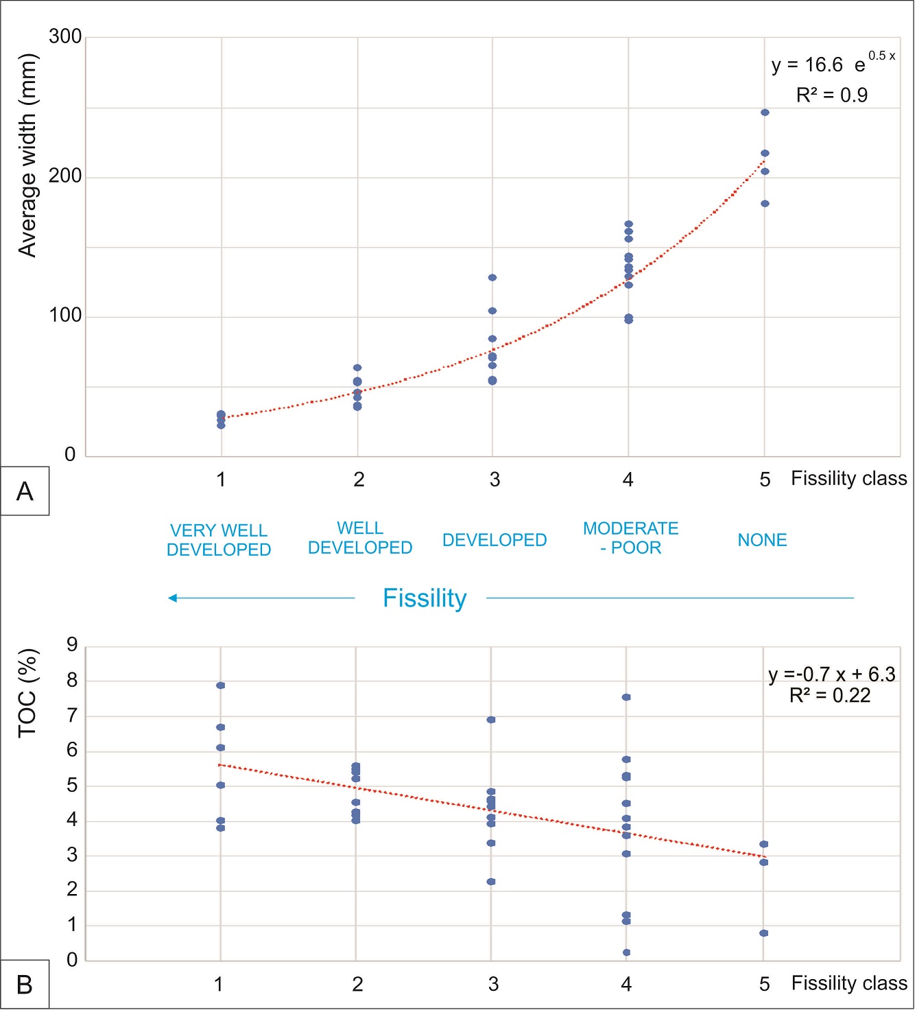 The visual classification of the samples displays a good correlation between fissility and the average width of the fragments as well as with their TOC values (Fig. 9). The more fissile the sample, the thinner their fragments and higher their TOC. Almost all the samples with high fissility (classes 1 and 2) have a TOC over 4%, whereas the rest of the classes have a wide range of TOC, except for the massive samples (class 5) that exhibit TOC under 4%.