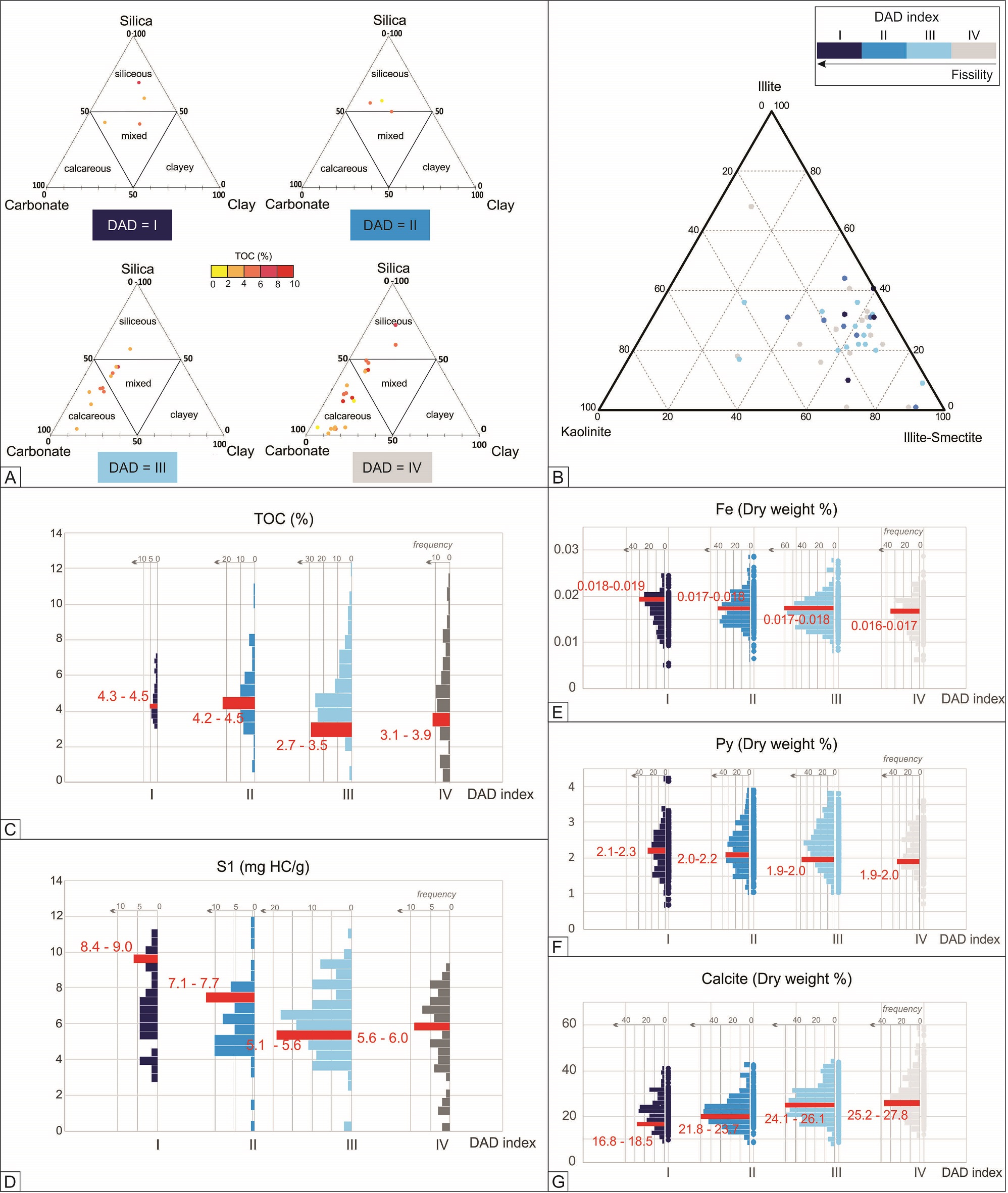 FIG 14. Results of DRX, pyrolysis analysis and mineralogical log. A. Ternary diagram showing Passey et al. (2012) mudstone rocks classification for each DAD class. B. Proportion of clay minerals in rocks of different fissility classes. C. TOC content. D. S1 values. Note that high fissility rocks show the higher organic matter content. E. Dry weight percentage of iron content. F. Dry weight percentage of pyrite content. G. Dry weight percentage of calcite. Histograms display mode interval values (in red) for each DAD class.