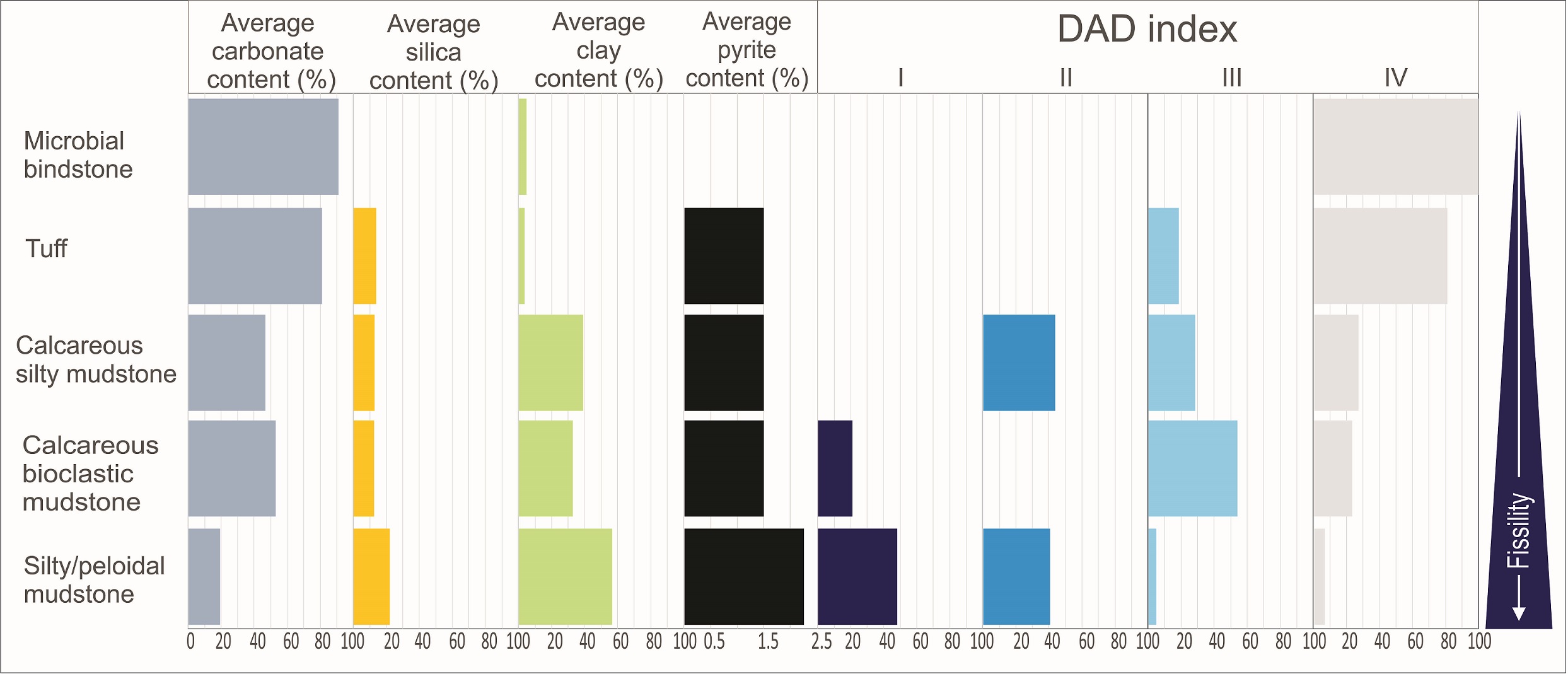 (i) Rocks with high potential fissility (DAD I and II) correlate with silty and/or peloidal siliciclastic mudstones and occasionally calcareous bioclastic and silty mudstones. These microfacies exhibit the lowest values of carbonate and the highest percentage of silica, clay and pyrite according to XRD measurements.