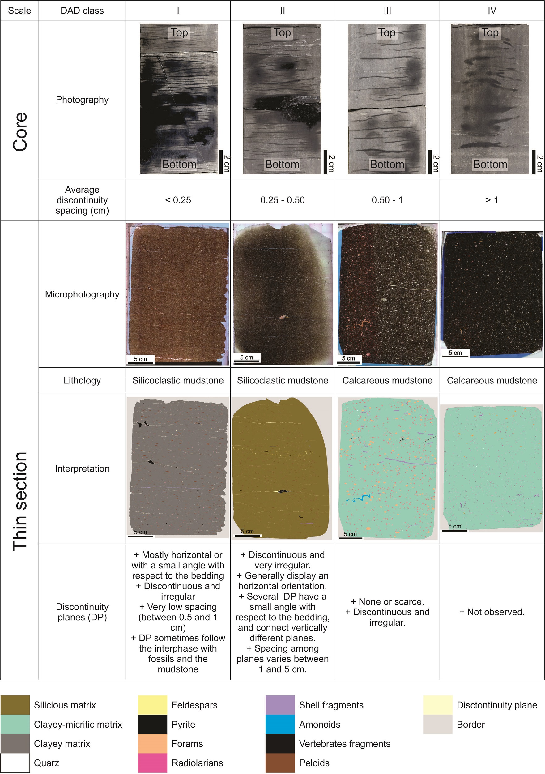 (ii) Low fissility and massive rocks (DAD III and IV) corresponds to partially calcitized tuffs and microbial levels and, to a lesser extent, calcareous silty mudstones. These rocks display higher values of carbonate content and lower percentages of silica, clay and pyrite. Tuffs intensively replaced by carbonates and bindstones corresponds uniquely to the DAD class IV. Likewise, calcimetry measurements exhibit a similar relationship with higher values for DAD classes III and IV. Figure 16 shows an example of each DAD classes at both core and petrographic section with a description of their discontinuity planes.
