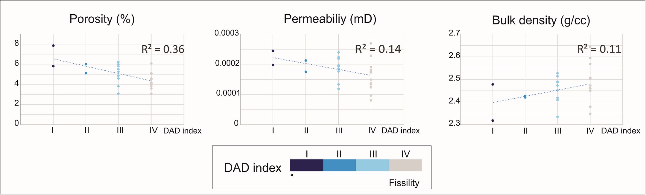 Analysis of the DAD index regarding principal petrophysical parameters shows that rock samples corresponding to high potential fissility present low density and high porosity and permeability values. Massive and low fissility samples are characterized by higher densities and lower values of porosity and permeability (Fig. 17).