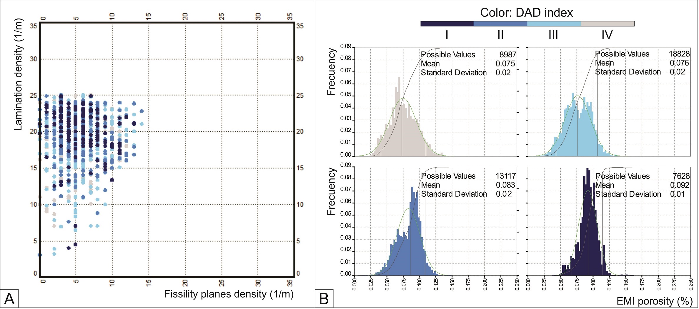 Porosity values compared with the DAD index (Fig. 18B) shows a positive correlation with fissility intensity: DAD class I shows mean porosity of 9.2% and a markedly unimodal distribution; DAD class II and III display lower porosity values (means of 8.3 and 7.6% respectively) and an incipient bimodal distribution; DAD class IV presents the lowest porosity values (mean of 7.5%) with a unimodal distribution.