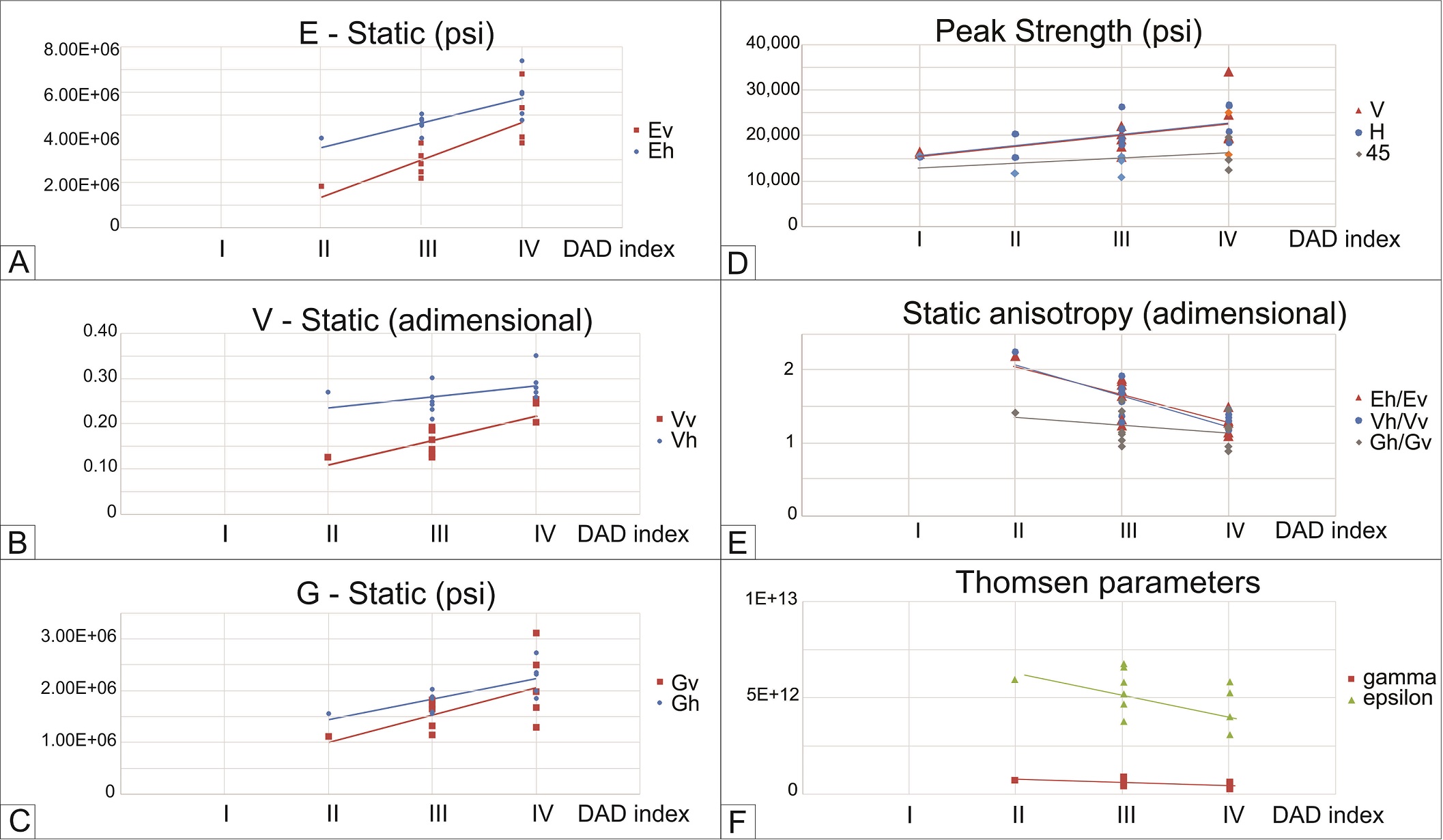 Geomechanical laboratory measurements display a significant anisotropy in the studied rocks (Table 1 in Varela et al., 2016), being horizontal plugs (parallel to the bedding) much stiffer than the vertical ones (perpendicular to the bedding). The anisotropy increases with fissility intensity (separation of the “v” and “h” trend lines, Fig. 20A-C). Both static and dynamic anisotropy parameters (ε and γ , Thomsen, 1986) show that high fissility rocks (DAD=II) are significantly more anisotropic than massive samples (DAD=IV). Even if most DAD class I rocks were undertested due to the difficulty to sample these highly fissile rocks, the few results obtained for this class confirm the general trends (Fig. 20).