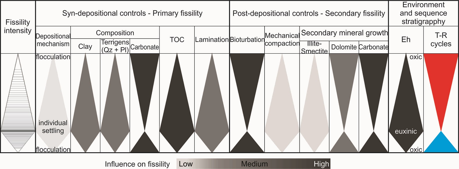 Numerous factors can be involved in fissility development (Table 1). These are separated into (i) those processes or conditions governing at the moment of sediment deposition, linked with the sedimentary environment, such as the depositional mechanisms and sediment composition, and (ii) those developed after mud deposition, such as bioturbation, and during diagenesis such as mechanical compaction, mineral alteration and secondary minerals growth. According to Lewis (1924) in the first case, the fissility would be primary (associated with depositional factors), whereas in the second case, the fissility would be secondary (associated with post-depositional processes).