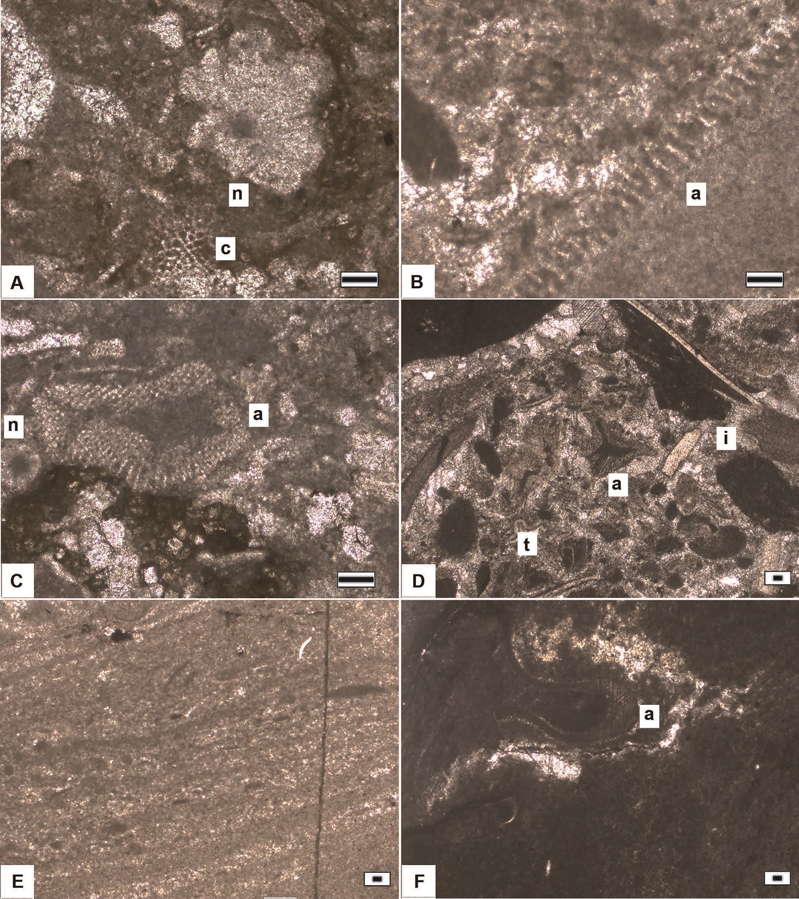 Bioclastic wackestone-packstone (BT1-BT4 samples): This microfacies is generally light to medium grey with diverse and abundant fossil fauna. The bioclastic and carbonate components consist of remains of brachiopods, pelmatozoan ossicles, gastropods, sponges, trilobites, ostracods, Nuia síbirica (Maslov, 1954) (Fig. 3A), algae, cyanobacteria (Fig. 3A), and pellets. The matrix is micritic, grey in color, locally which is recrystallized and cemented by sparite.