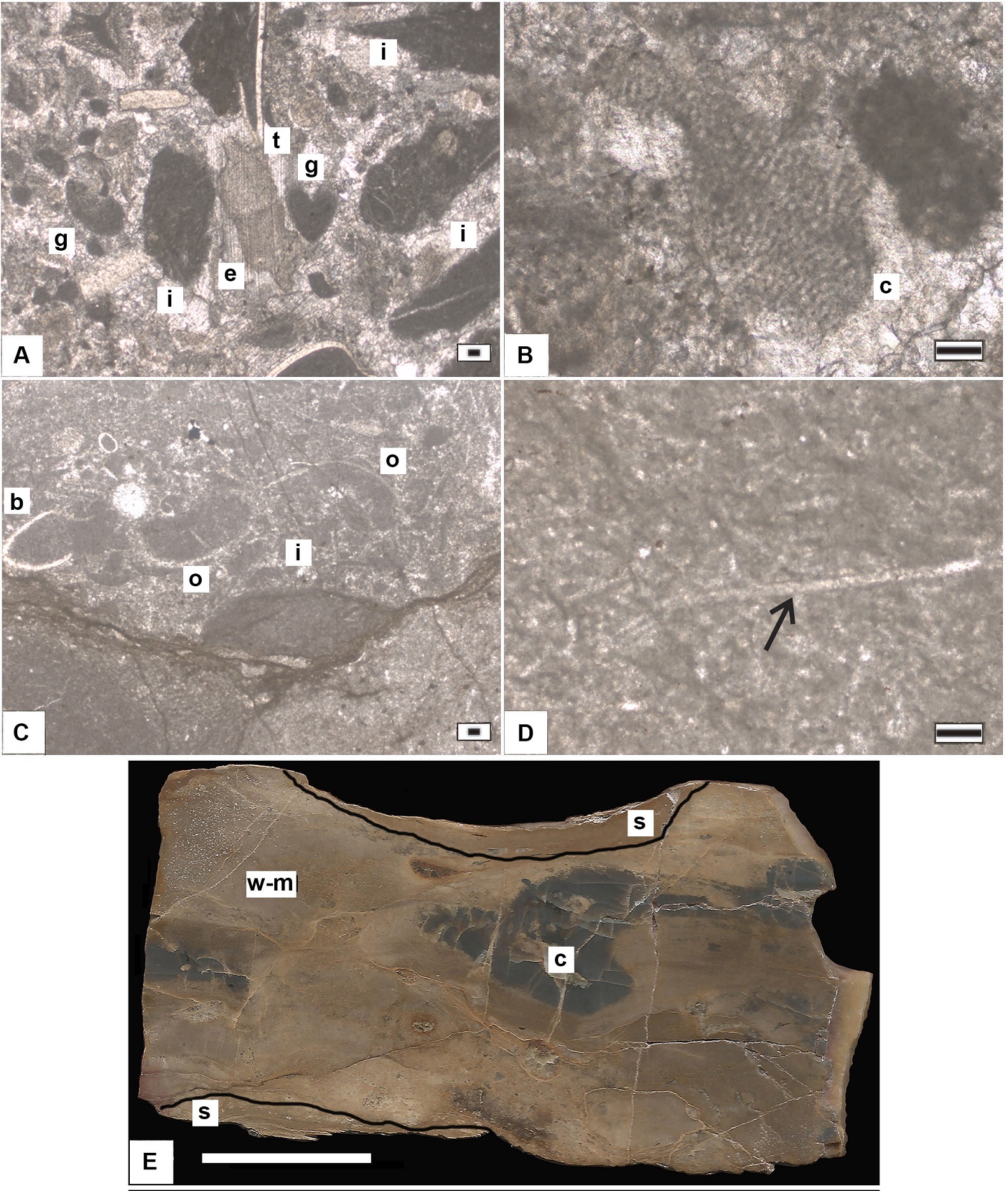 Bioclastic packstone-wackestone (BT6-BT9 samples): This microfacies contains abundant large-sized sponges on the bedding surface and shell debris of echinoderm, brachiopods, ostracods, gastropods, scarce calcareous algae and intraclasts (Fig. 3F) that are either embedded in a micritic matrix or are nearby cemented by sparite (Fig. 4C). Locally, it is observed a possible microbialite represented by alternating types of micritic laminae, one with darker dense micritic, and another with lighter micritic and scattered intraclast, giving rise to an alternating simple lamination (Fig. 3E) (Monty, 1976). The bioturbation is intense along of this facies and there are several colored firmground/hardground on the beds surface.
