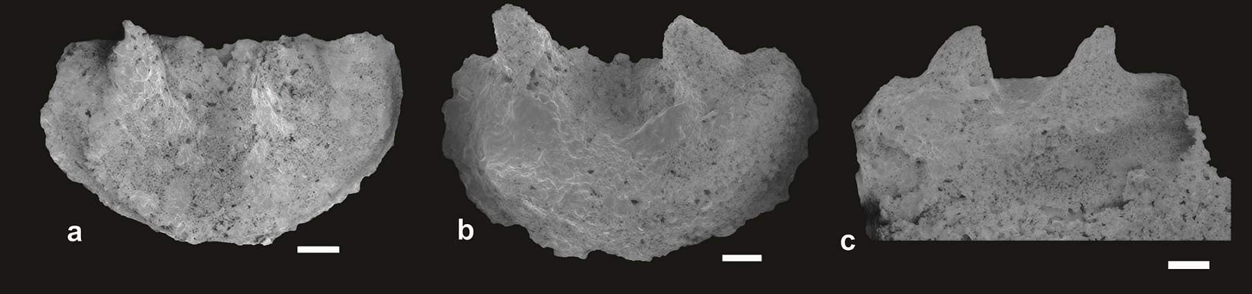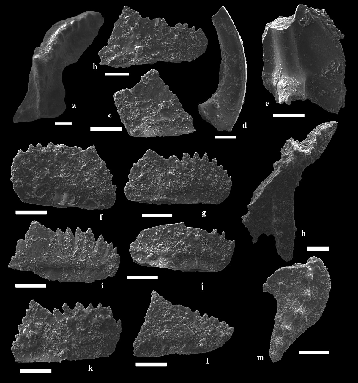 Description: In the Los Baños de Talacasto section were retrieved symmetrical Sa (Fig. 5e) and asymmetrical Sb (Fig. 5d) elements. The Sa shows a stronger carina on the anterior margin and a thicker prominent costa on the posterior margin of the cusp. Also, exhibit blade-like lateral edges on each side of the cusp. The Sb element shows a strongly extending downward lateral blade.