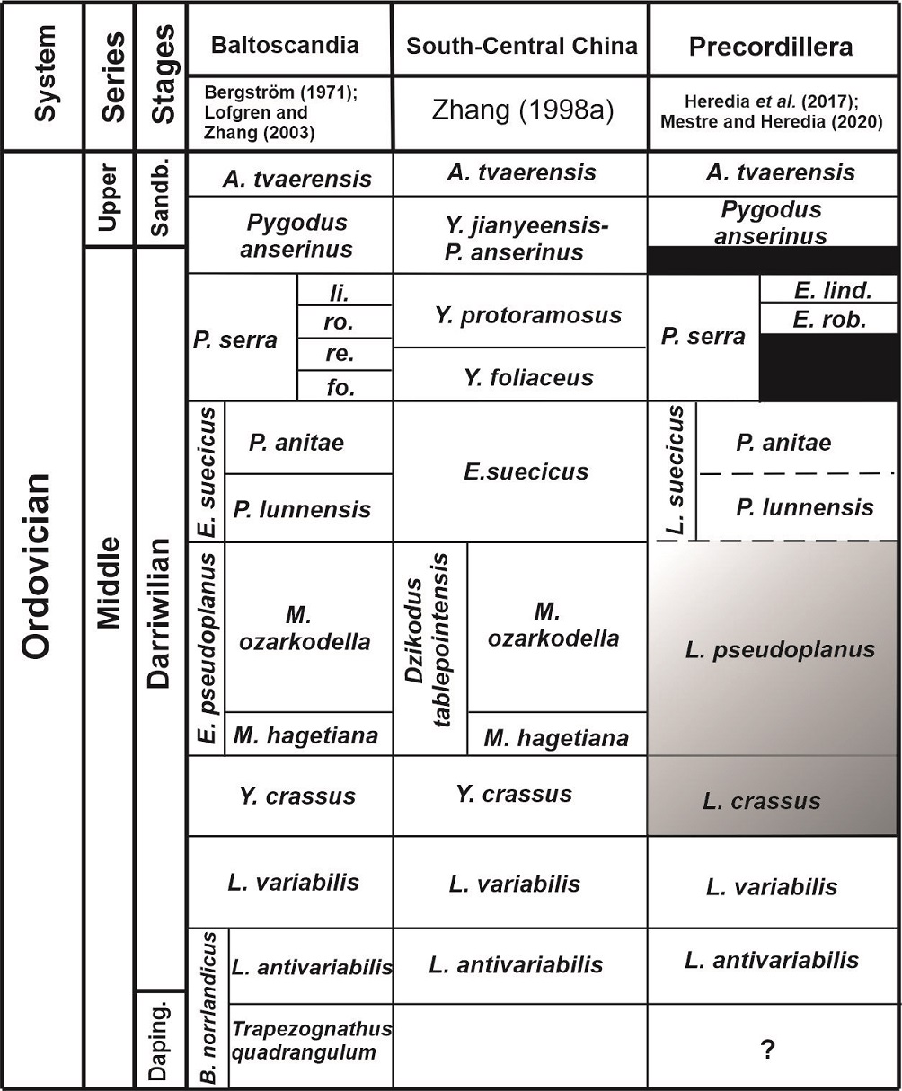 The Darriwilian conodont biostratigraphy from the Precordillera in western Argentina has experimented a substantial improvement in last years. Several extensive studies on conodonts recovered from different sections in Central and Eastern Precordillera (Heredia and Mestre, 2011, 2013; Feltes et al., 2016; Mestre and Heredia, 2013a, b, 2020a, b; Mestre, 2014; Heredia et al., 2017; Mango et al., 2019; Serra et al., 2017a) suggest affinity to Baltoscandia and South China for this time interval. Recently, Heredia et al. (2017) and Mestre and Heredia (2020b) refined the Darriwilian conodont biostratigraphy for the Precordillera, recording the lower and upper boundaries of this stage and documented the following biozones (in ascending order): the Lenodus antivariabilis, Lenodus variabilis, Lenodus crassus, Lenodus pseudoplanus, Lenodus suecicus (Pygodus lunnensis and Pygodus anitae subzones), and Pygodus serra (with Eoplacognathus robustus and Eoplacognathus lindstroemi subzones).