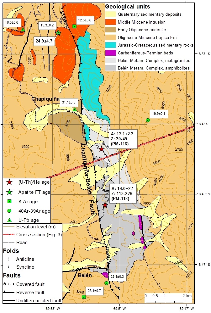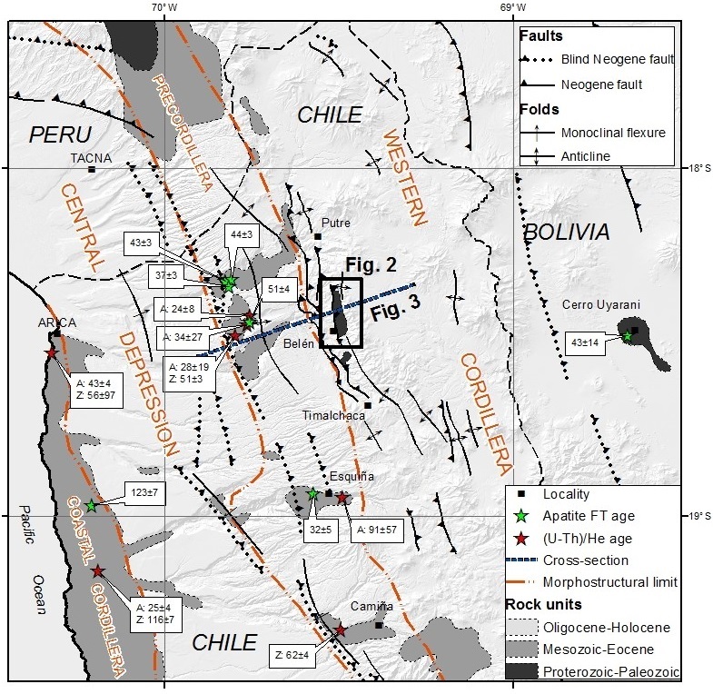 Fig. 1. Simplified geological map of the northernmost Chile, westernmost Bolivia and southernmost Peru showing distribution of rock units, main structures, morpho-structural domains, available thermochronological ages (in Ma), and location of the figure 2 (Belén area) and figure 3 (structural cross-section). Geology based on maps of the Geological Surveys of Chile, Bolivia and Peru. Proterozoic-Paleozoic rocks are metamorphic, Mesozoic-Eocene rocks are igneous and sedimentary, and Oligocene-Holocene units are continental volcanic and sedimentary rocks and unconsolidated deposits. Note the absence of Proterozoic to Eocene bedrock outcrops in the Western Cordillera. Thermochronological ages are previous to this study. (U-Th)/He ages are from Avdievitch et al. (2018). Apatite fission-track ages are from Schlunegger et al. (2006) in Chile and Barnes et al. (2012) in Bolivia. Some zircon and apatite fission-track ages and AHe ages are reported in the Belén and Uyarani areas, but their sample locations and other details are unknown (see text).