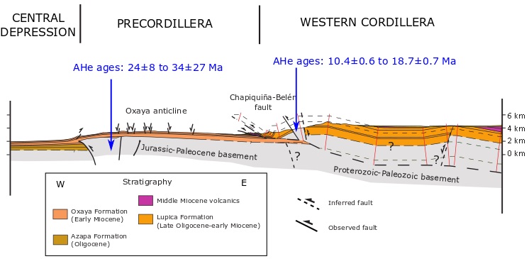 The middle-late Miocene thermal signal of this part of the Western Cordillera is relatively similar to that the eastern Altiplano (Eastern Cordillera and Subandean belt), according the AFT and AHe data reported there (Gillis et al., 2006; Ege et al., 2007; Barnes et al., 2012; McQuarrie et al., 2008; Perez et al., 2016; Anderson et al., 2018). However, this signal differs considerably from that the forearc (from the Coastal Cordillera to Precordillera) and the eastern Western Cordillera. At this latitude, in the first domain (forearc), the available AHe ages are from 24±8 to 43±4 Ma (Avdievitch et al., 2018), AFT ages are from 37±3 to 123±7 Ma (Schlunegger et al., 2006), and models indicates an extremely low exhumation rate, while in the second domain (eastern Western Cordillera, Uyarani basement), the available AHe and AFT ages are greater than 34 Ma (Horton et al., 2006; Barnes et al., 2012). The last ages are compatible with the early Oligocene exposition of the BMC and the Incaic orogeny that affected the arc and inner forearc (Steinman, 1929; Mégard, 1987; Noblet et al., 1996; Maksaev and Zentilli, 1999; Charrier et al., 2013; García et al., 2017). This suggests that during the Miocene the cooling-uplift of the western part of the Western Cordillera was coupled to the eastern Altiplano and decoupled from the forearc and eastern Western Cordillera. In contrast, before 18 Ma, in particular during the Incaic orogeny, the exhumation of the Western Cordillera seems to have coupled to the forearc. More (U-Th)/He analyses in the BMC and other geological units, and more thermo-chronometers, are needed to more robust conclusions on the exhumation and burial history of the Western Cordillera.