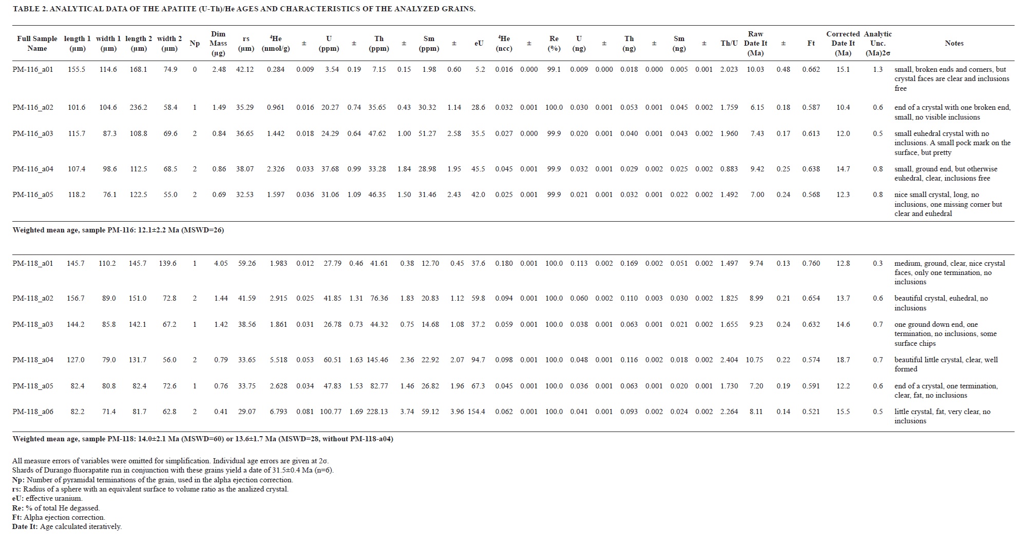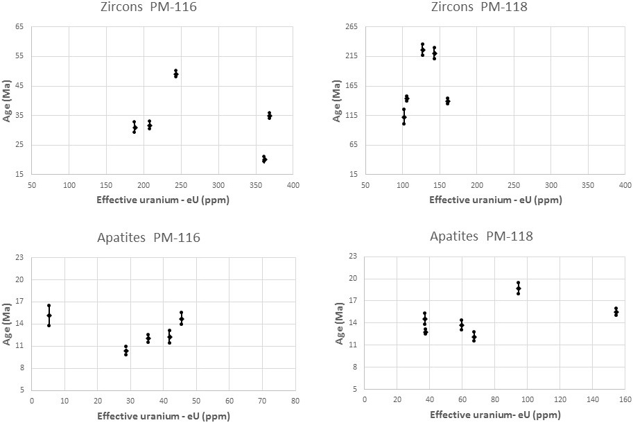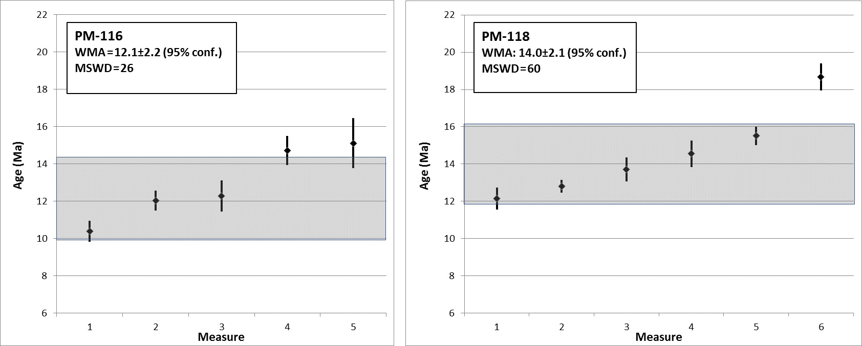 The sample PM-116 gives an AHe weighted mean age of 12.1±2.2 Ma (MSWD=26), and the PM-118, 14.0±2.1 Ma (MSWD=60). For the sample PM-116, if the higher single-grain age of 15.1 Ma (PM-116-a01) is ignored by low Re, the weighted mean age results of 12.0±2.6 Ma with a MSWD of 27. For the sample PM-118, if the higher single-grain age of 18.7 Ma is ignored, the weighted mean age results of 13.6±1.7 Ma with a MSWD of 28, a value considerably lower than 60. In any cases, the MSWDs of 26-28 are high and data fail the chi-square test, thus, the weighted mean ages should be viewed with caution.