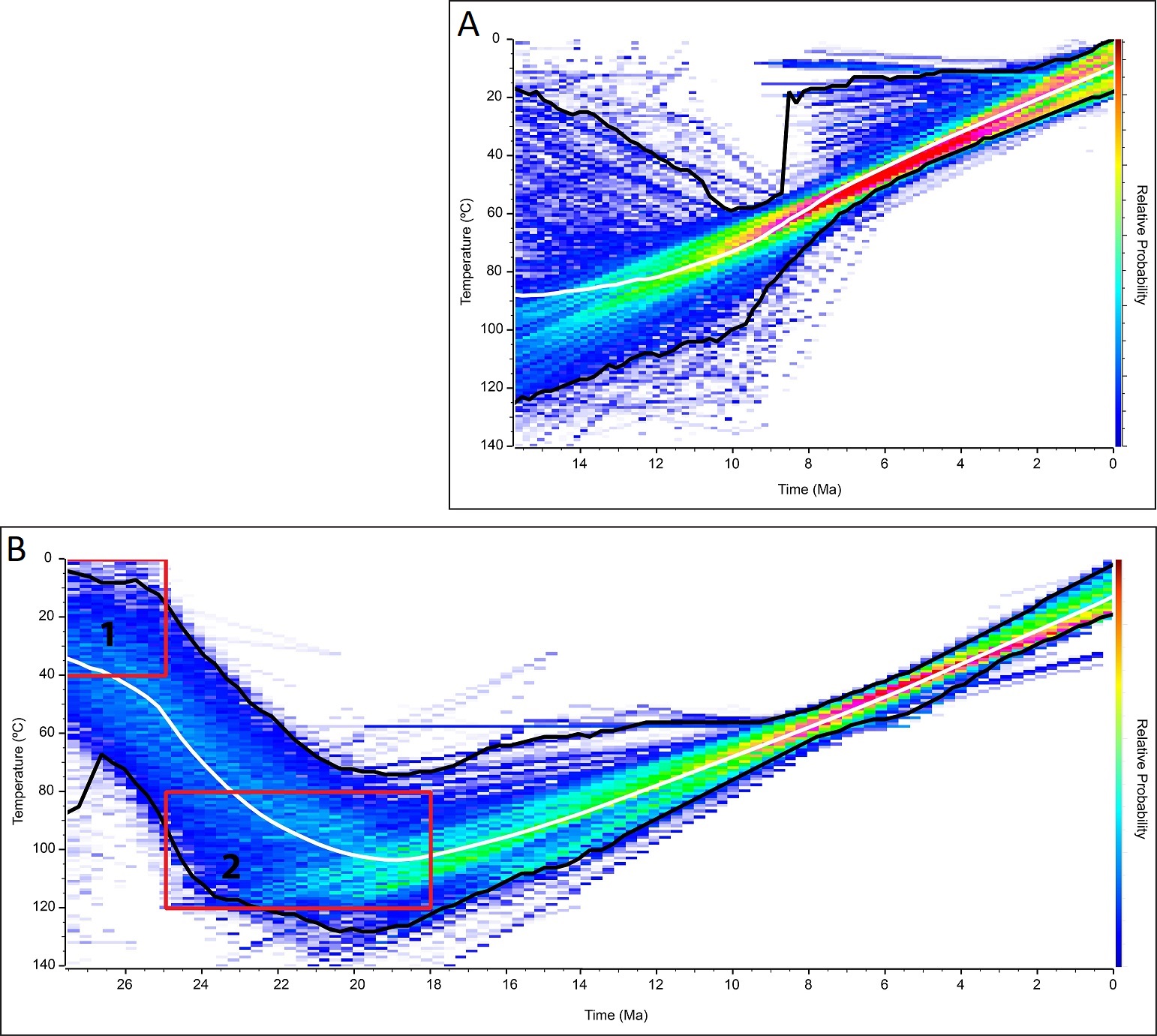 Fig. 6. A and B Inverse thermal models from the four selected ages of the sample PM-116 (see text), using the QTQt v 5.6.0 software (Gallagher, 2012). The withe line shows the most probable path whereas the black lines, the range of this path. In B, the red squares indicate geological constraint points: (1) 20 ±2 0 °C at 27.5 ± 2.5 Ma considering as the exposition period of the Belén Metamorphic Complex; and (2) 100±20 °C at 21.5±3.5 Ma, as the burial period provoked by the Lupica Formation deposition over the BMC and associate volcanic activity.