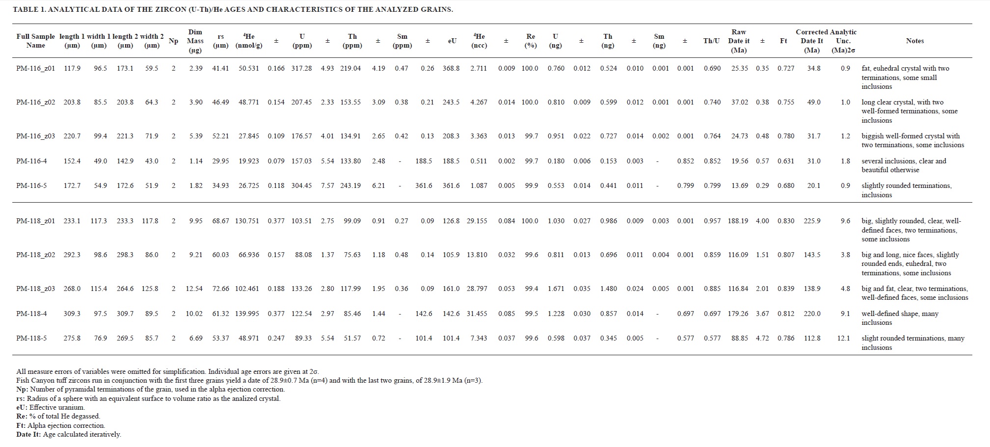 The five picked zircon grains of the sample PM-116 are euhedral crystals, with widths >43 µm and lengths <221 µm. Crystals show some inclusions and two terminations with slightly rounded ends (Table 1). The (U-Th)/He measures in zircon produced individual ages of 20±1, 31±2, 32±1, 35±1 and 49±1 Ma. Three ages are in the range 31-35 Ma (early Oligocene). No clear trend is observed between single-grain ZHe ages and effective uranium (Fig. 4).
