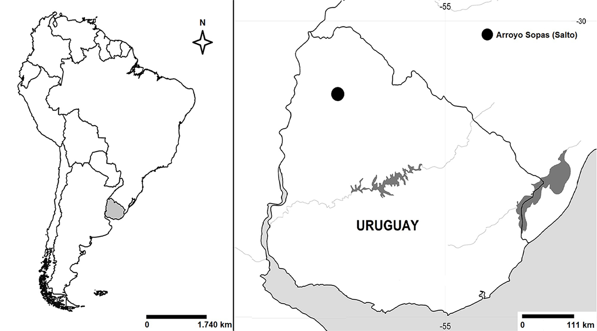 Procedencia geográfica y estratigráfica. Arroyo Sopas, departamento de Salto. Formación Sopas.Pleistoceno Tardío.