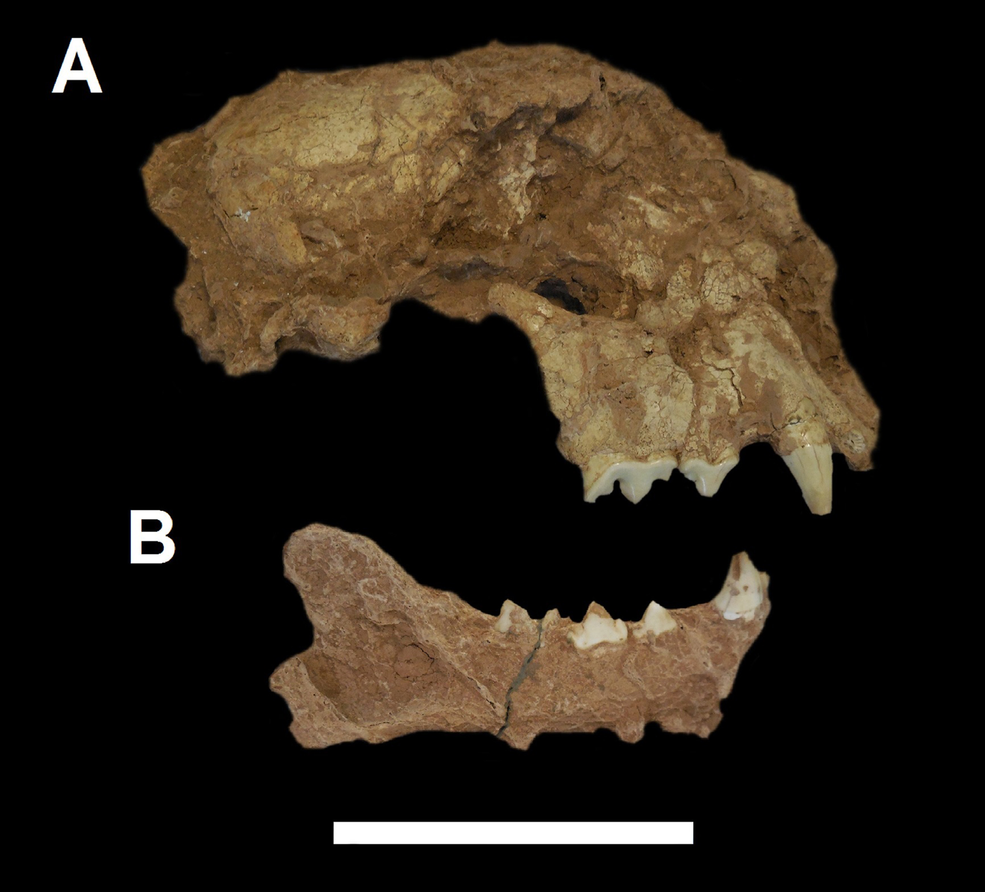 FIG. 2. MGT 1150, cráneo y mandíbula. A. Cráneo en vista lateral derecha; B. Mandíbula en vista lateral derecha. Escala 10 cm.