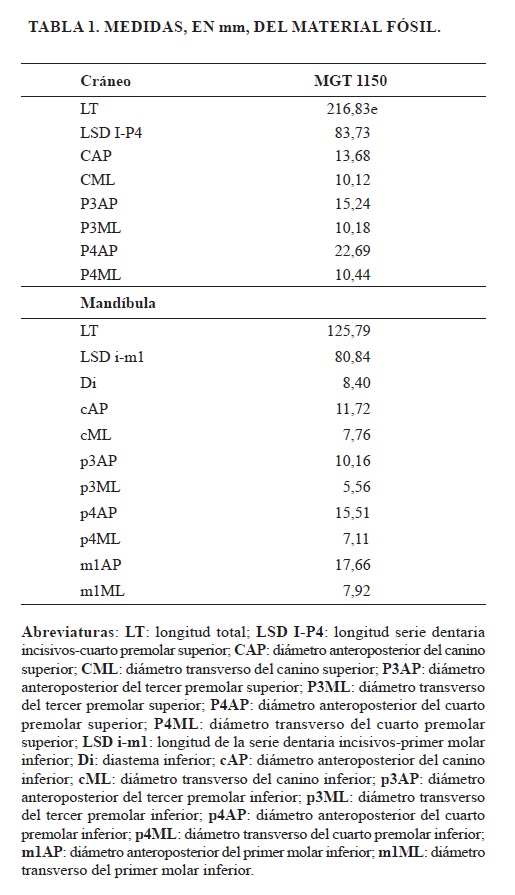 Material referido. MGT 1150, cráneo y mandíbula (Fig. 2, Tabla 1, Apéndice 3).