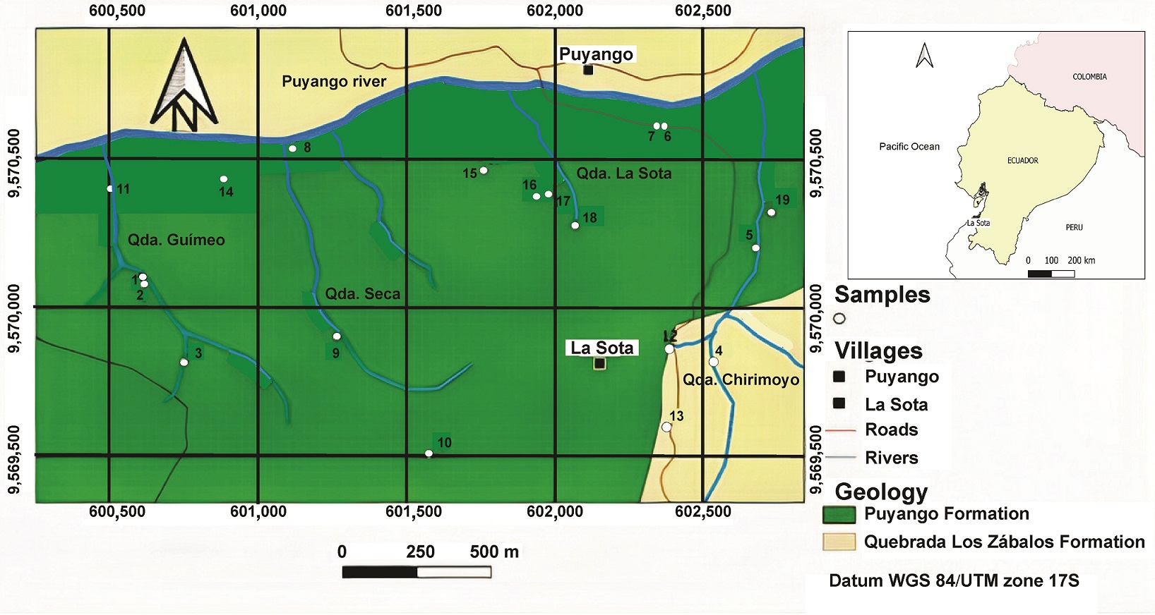 Two main rock formations of Lower Cretaceous age outcrop in this area, the Quebrada Los Zábalos and Puyango formations (Fig. 2). With an estimated thickness of 400 m, the former consists of siltstones, light gray fine-grained quartz sandstones, fine to medium conglomerates, greenish graywackes embedded with fine-grained gray to medium-grained silicified sandstones, and thin layers of shales (mudstones), deposited in a continental fluvial environment, with development of contemporaneous volcanism (Carrasco, 2018). This formation hosts large fossil trunks and leaf imprints. It overlies pre-Carboniferous sedimentary rocks of El Tigre Formation on a non-conformity and underlies the Puyango Formation (INIGEMM, 2017). The Quebrada Los Zábalos Formation has been attributed an Aptian-Albian age (Jaillard et al., 1999). The Albian-age Puyango Formation (Shoemaker, 1982) consists of sequence of black limestones, turbidites, calcareous shales and calcarenites of ca. 300 m thick, deposited in an open platform as a result of marine transgression. These rocks are strongly deformed and present calcite veinlets. The presence of fossil remains is very common, including mainly ammonites, bivalves and small corals. It is capped by the Chaquino Formation of the Zapotillo Group with an angular unconformity (Jaillard et al., 1999).