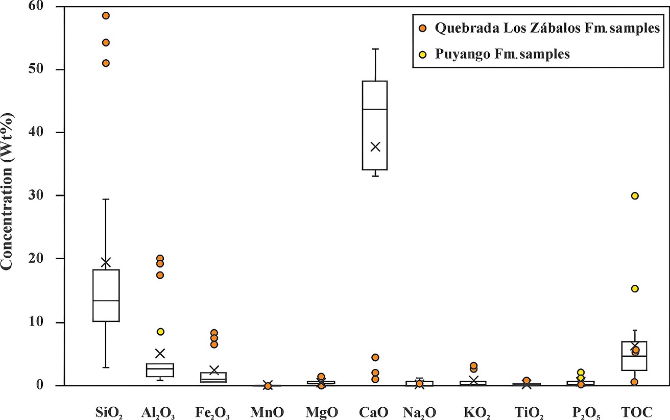 FIG. 4. Box-plot diagram for major elements of the samples. Limestone samples from the Puyango Formation. Samples from the Los Zábalos Formation are plotted separately. X represents the median.