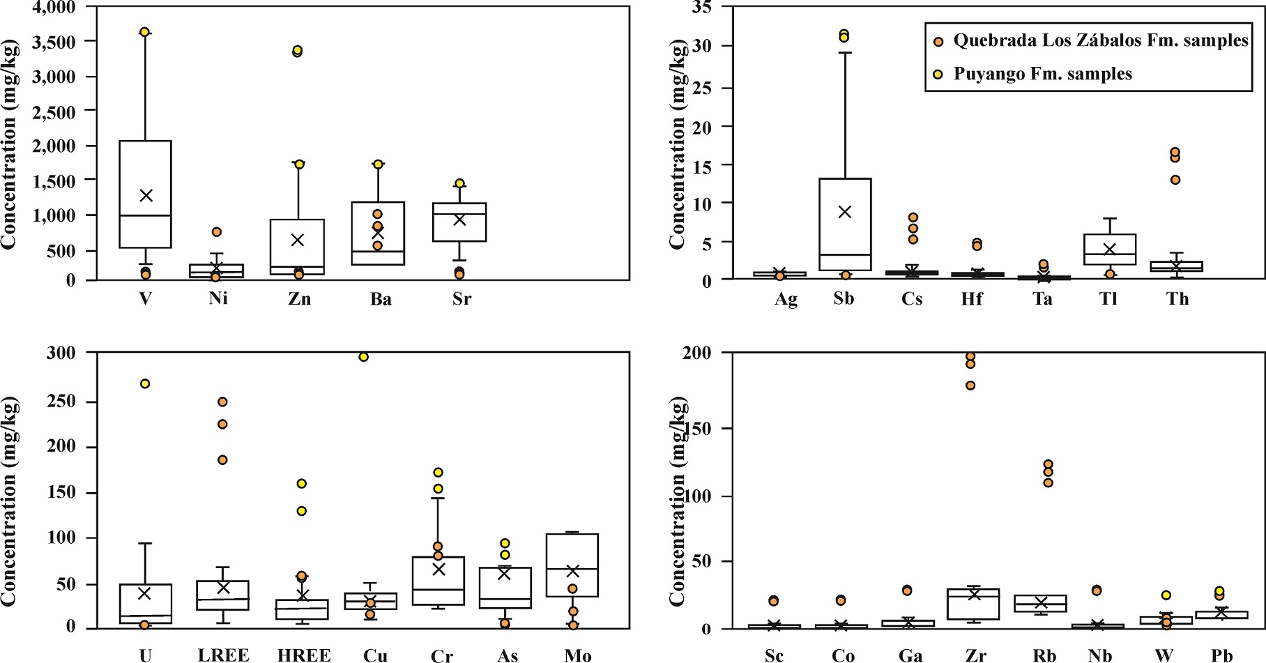 FIG. 5. Box-plot diagrams for trace element contents in limestone samples from the Puyango Formation. Samples from Quebrada Los Zábalos Formation are plotted separately. X represents the median.