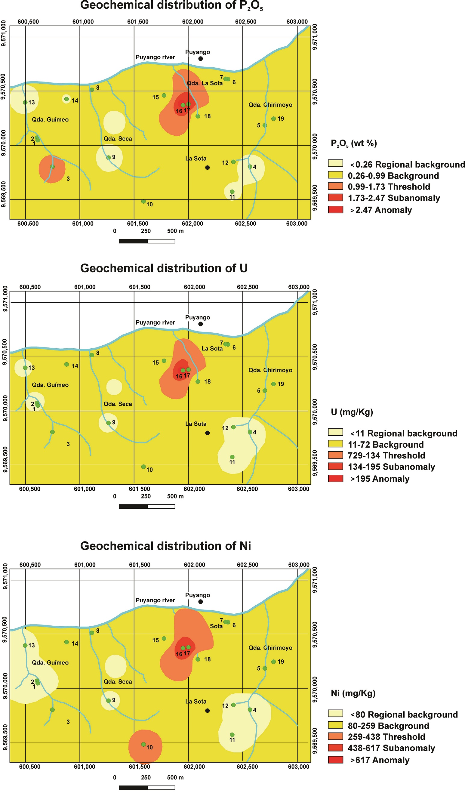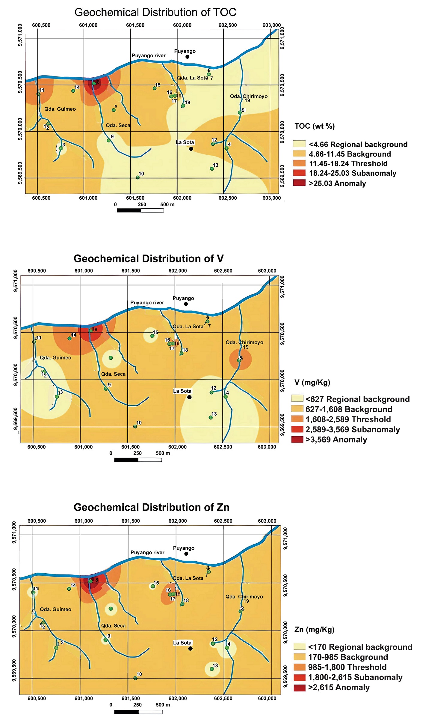 In the La Sota area the geochemical V anomaly (>3,569 mg/kg) is accompanied by high Zn (>2,615 mg/kg) and TOC (>25.03 wt%) contents, and spatially related to the bituminous black limestones of the Puyango Formation. Whereas, U shows anomalies exceeding 195 mg/kg together with high concentrations of P2O5 (>2.47 wt%), and Ni (>617 mg/kg).