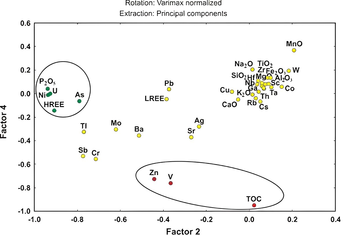 The Principal Component Analysis (PCA) using the rotation method with varimax normalized (Fig. 10) shows the association between Zn, V and TOC in the lower part of the diagram. However, these elements are somewhat distanced on the horizontal axis (Factor 2), which may imply that V and Zn could occur in organic and inorganic forms. Several elements also grouped in the upper right section of the plot. These mostly corresponded to lithophile elements that form minerals of detrital origin and carbonates.
