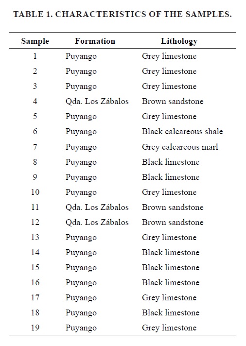 The concentration of the major elements in the analyzed samples is shown in figure 4. The results confirmed that the limestones belonging to the Puyango Formation display a low content of MgO. The detrital component was significant, as evidenced by the concentration of SiO2 ranging between 10 and 20 wt%. Also of note was the presence of organic matter (TOC) with an average content of 6.25 wt%. Minor components were Al2O3 and Fe2O3.