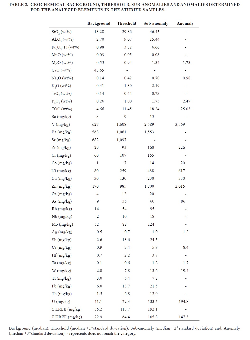 The background values (median), threshold (median+standard deviation), sub-anomalies (median+2 standard deviation) and anomalies (median+ 3 standard deviation) of the studied samples were calculated for all elements (Table 2) following the methodology used by Howarth (1983). Light and heavy rare earth elements were grouped within LREE and HREE, respectively.