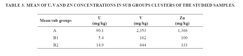 Cluster B includes a subgroup (B1) with samples that have the highest concentrations of SiO2 and Al2O3 (4, 11, 12). These samples corresponded to the siliciclastic rocks of the Quebrada Los Zábalos Formation, and they show the lowest concentrations of V, Zn and U (Table 3), all below the background values calculated in the present study (Table 2). Although they belong to limestones of the Puyango Formation, samples 2 and 9 were included in this subgroup due to their low concentrations of V, Zn and U.