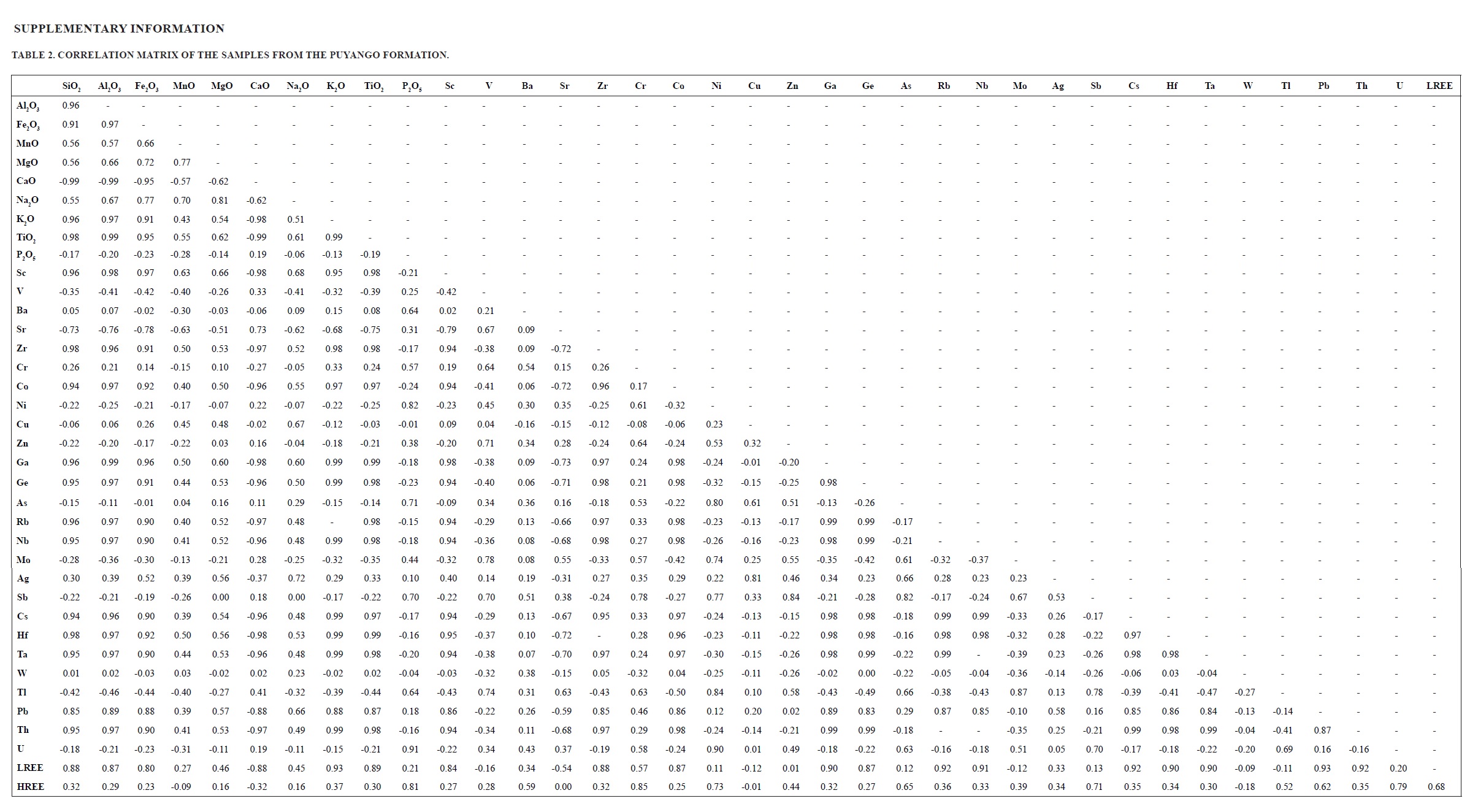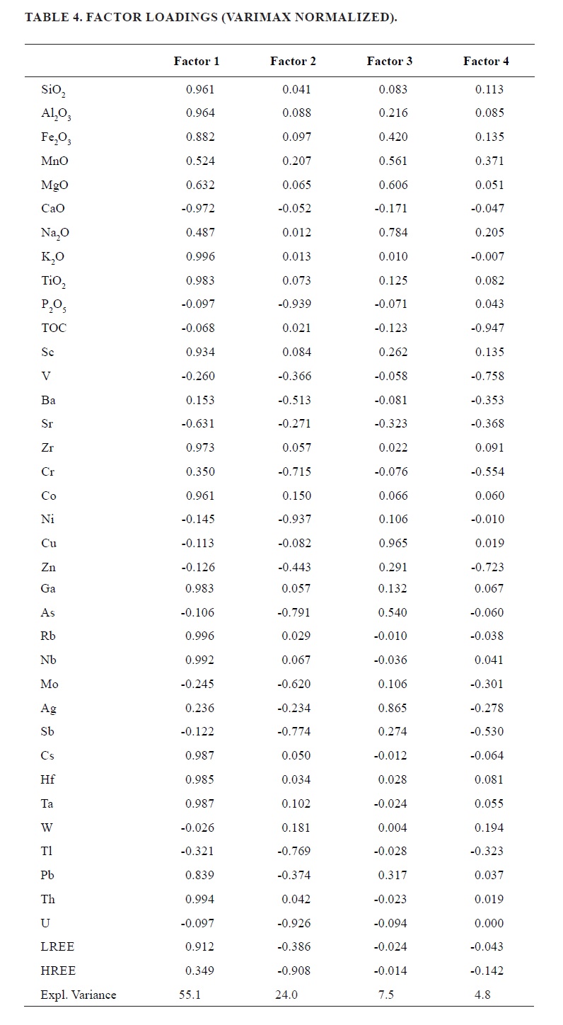 Thus, according to the factor analysis, the following four geochemical associations can be inferred: 1) disseminated organic matter (TOC) in the limestones in which V and Zn are hosted, probably forming organometallic complexes; 2) phosphatic minerals that contain high concentrations of U, HREE and Ni as trace elements, both associations probably formed during sedimentation in an anoxic environment (Shields and Stille 2001; Kidder et al., 2003); 3) Ca which forms mainly calcite that composes the limestones of the Puyango Formation (INIGEMM, 2013) and; 4) Litophile elements contained in detritic minerals, such as quartz, plagioclase, feldspar, micas, clays and oxyhydroxides of Fe-Mn-Ti, caused by the clastic contribution within the sedimentary basin and, in this study, associated mainly with the calcareous shales of the Puyango Formation, and on the other hand, corresponding to the samples of fluvial origin belonging to the Quebrada Los Zábalos Formation.