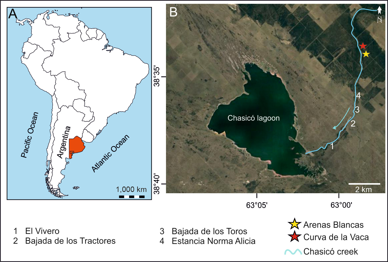 The Quaternary of the Chasicó creek is represented by Late Pleistocene and Holocene deposits represented by the in-fill of a fluvial valley incised in the Upper Miocene substrate. First, Fidalgo et al. (1987) recognized several informal units overlying this substrate: 1) the Grava Arenosa Salinas Chicas, constituted by sandy gravels cemented by calcium carbonate; 2) the Conglomerado Bajada de Los Toros, represented by fine to medium gravels of rounded white and pink quartzites from the Ventania basement, and sandy siltstones intraclasts of the Upper Miocene substrate cemented by calcium carbonate; 3) the “Grava Arenosa y Limo Sanquilcó”, characterized by layers of brown to gray sandy gravel that alternates with sands, silts, and even clays; the gravel clasts are made up of rounded white and pink quartzites from the Ventania basement; 4) finally, in some cases, these coarse levels are capped by silty sands sediments, assigned to eolian deposits of the Holocene Estancia La Aurora Formation (Fidalgo et al., 1987), from which scarce Quaternary fossils were recovered: Rhea americana, Ozotoceros bezoarticus, Dolichotis patagonum, Lama guanicoe, and Ctenomys sp.