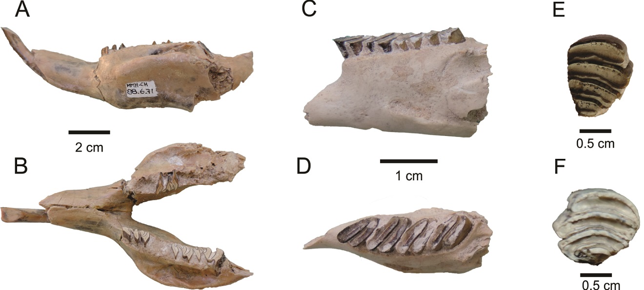 The almost complete mandible MMH-CH-88-6-71 assigned to the caviid Cardiatherium chasicoense (Fig. 6A, B) was previously referred to this species and described in detail by Deschamps et al. (2007). Isolated molariforms are assigned to Cardiatherium sp., based on their morphology and size. The species C. chasicoense is the oldest known capybara and it is considered characteristic of the Chasicoan Stage/Age (Deschamps et al., 2007, 2009, 2013; Vucetich et al., 2014). Deschamps et al. (2009) mentioned the presence of this species in levels of the Loma de Las Tapias Formation (San Juan Province) correlated with the Chasicoan Stage/Age, which represents the only known record out of the Pampean region, which allows extending this stage/age up to near 8 Ma (Deschamps et al., 2013). Cardiatherium aff. C. orientalis was mentioned for early and late Huayquerian assemblages from La Pampa Province (Deschamps et al., 2013).