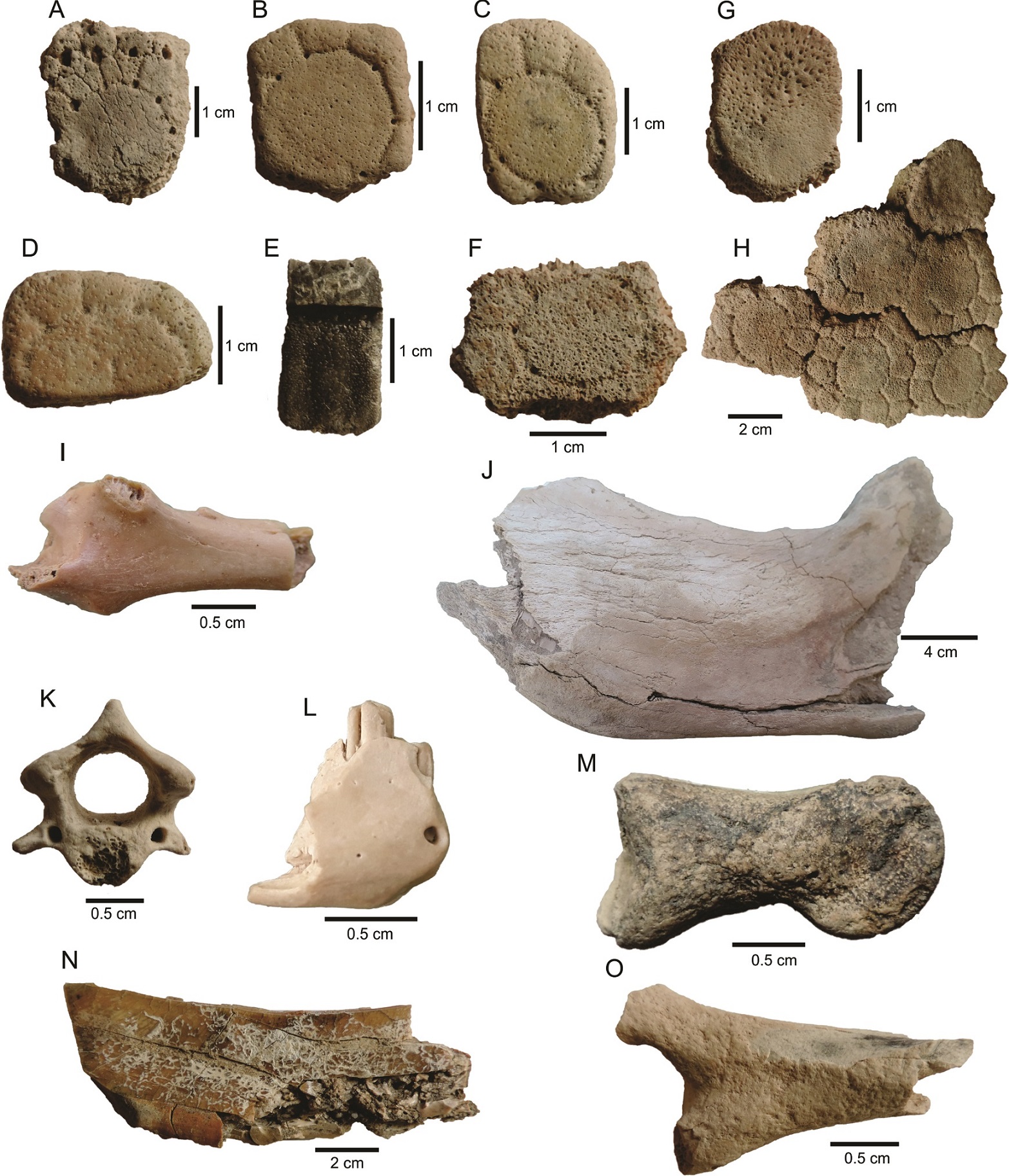 Chlamyphorids from Arenas Blancas site are represented by isolated osteoderms identified as: Euphractinae Eutatini Chasicotatus ameghinoi (Fig. 5D, E), Euphractini Macrochorobates scalabrinii (Fig. 5F, G) and Proeuphractus sp. (Fig. 5H), and the Tolypeutinae Priodontini Vetelia perforata (Fig. 5I). The holotypes and several referred specimens of C. ameghinoi and V. perforata come from the Chasicoan assemblage of the Chasicó creek. For each taxon, there are not differences in the size and ornamentation pattern between the Arenas Blancas specimens and those from Chasicoan and Huayquerian assemblages from Buenos Aires and La Pampa provinces (Scillato-Yané, 1982; Esteban et al., 2001; Urrutia et al., 2008; Scillato-Yané et al., 2010). The presence of Chorobates cf. C. villosissimus mentioned by Oliva et al. (2011; Table 1) cannot be corroborated.