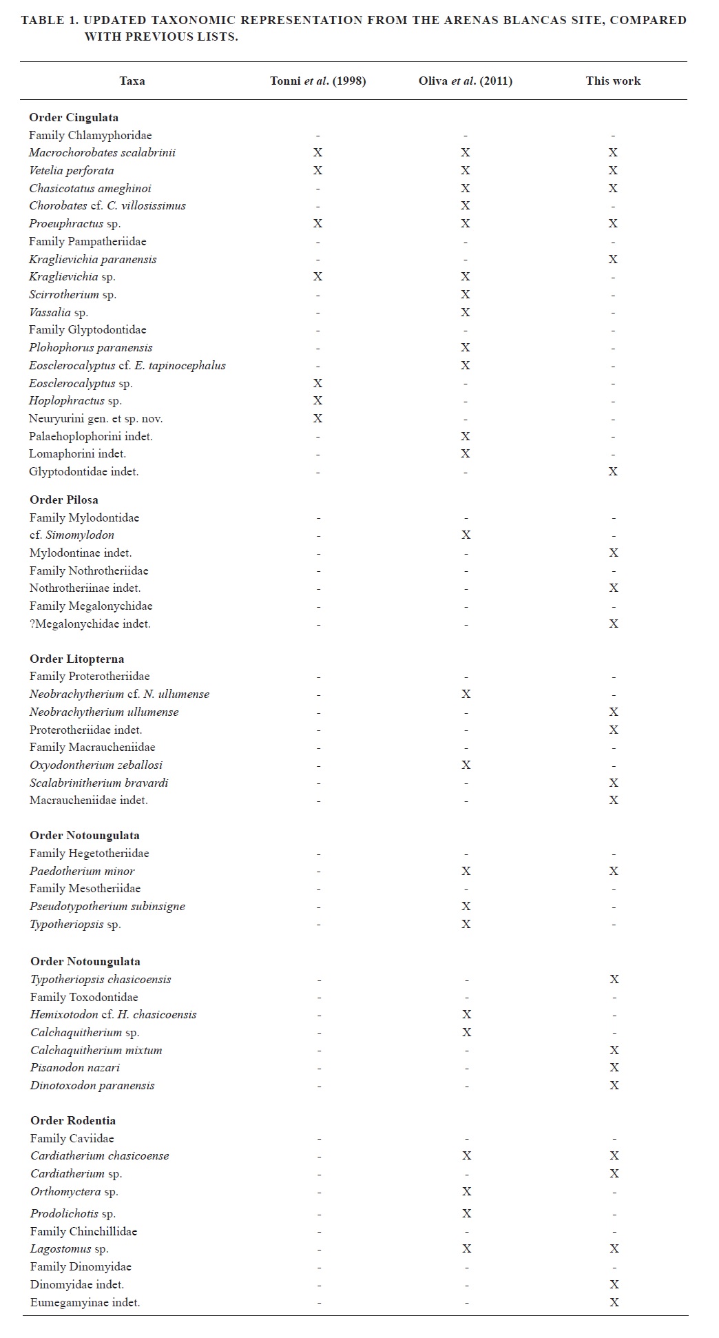 In summary, most of the taxa identified in the Arenas Blancas assemblage are also present in other assemblages of the Pampean region with Upper Miocene deposits of the CAF (Table 2). The highest taxonomic similarity is with the Chasicoan assemblage of the Chasicó creek and, to a lesser extent, with Chasicoan and early Huayquerian assemblages of La Pampa Province (Table 2). The main aspects to highlight are: 1) the chlamyphorid Macrochorobates scalabrinii, used to define a biozone for the early Huayquerian Stage/Age, is present in different assemblages assigned to both Chasicoan and Huayquerian stages/ages; 2) the caviid Cardiatherium chasicoense is also present in the Chasicoan assemblage of the Chasicó creek. This species was considered as biostratigraphic indicator of this stage/age; 3) the notoungulates Calchaquitherium mixtum and Dinotoxodon paranensis are absent from all the other assemblages, and their identification in Arenas Blancas site represents the first record of both species in the Pampean region; 4) the litoptern Scalabrinitherium bravardi and the toxodontid Pisanodon nazari are absent, up to now, from other Chasicoan assemblages, but they are present in Huayquerian assemblages; and 5) the pampatheriid Kraglievichia paranensis and the litoptern Neobrachytherium ullumense are also present in the Chasicoan assemblage of the Chasicó creek.