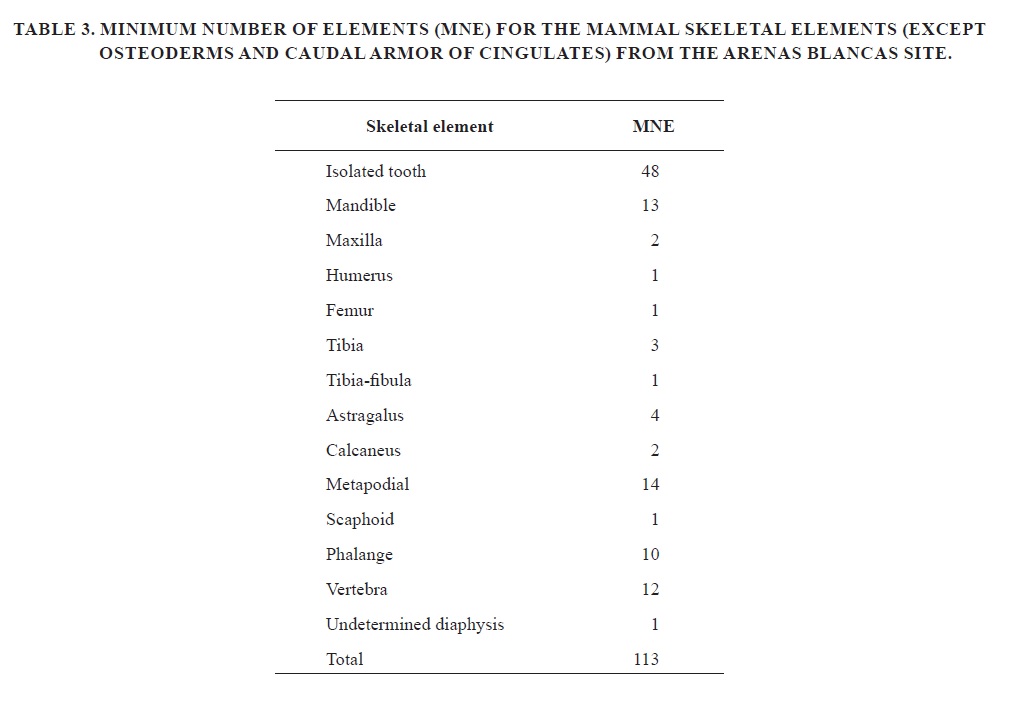 Most of the recovered specimens correspond to osteoderms of the dorsal carapace, caudal rings, and caudal tube fragments of xenarthran cingulates (67.44%; MNE=234); this predominance is related to its great preservation potential due to the high number of osteoderms present in a single dorsal carapace (Gillette and Ray, 1981; Montalvo et al., 2016). This characteristic was reported in several late Cenozoic deposits of the Pampean region (Montalvo, 2004; Tomassini et al., 2013; Sostillo, 2016; Montalvo et al., 2016, 2022), including the Chasicoan levels of the CAF in the Chasicó creek (Barasoain et al., 2022). The remaining specimens (32.56%; MNE=113) include cranial and postcranial elements corresponding to other mammal groups.