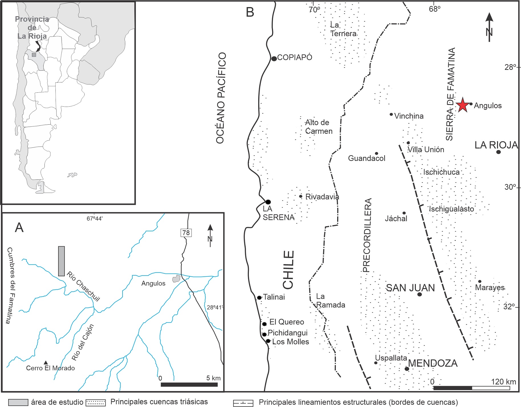 FIG. 1. Ubicación del área estudiada. A. Detalle de la ubicación de la localidad tipo. B. Bosquejo de la distribución de cuencas triásicas en la región y ubicación del área estudiada (estrella roja).