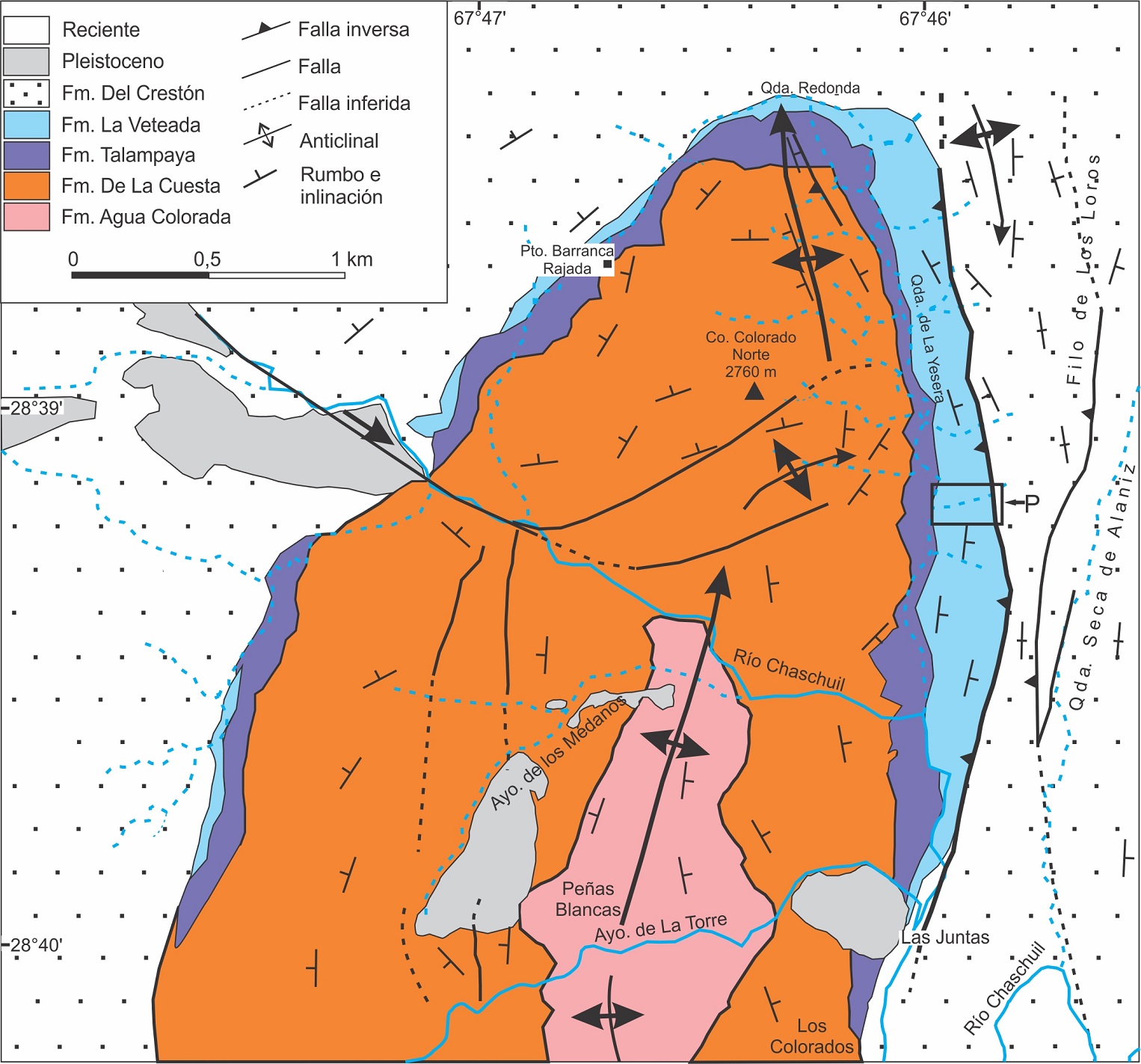 FIG. 2. Mapa geológico de la culminación septentrional del anticlinal de Los Colorados y la quebrada de La Yesera. El recuadro con la letra P indica la quebrada donde fue analizada la sección estratigráfica mostrada en la figura 6.