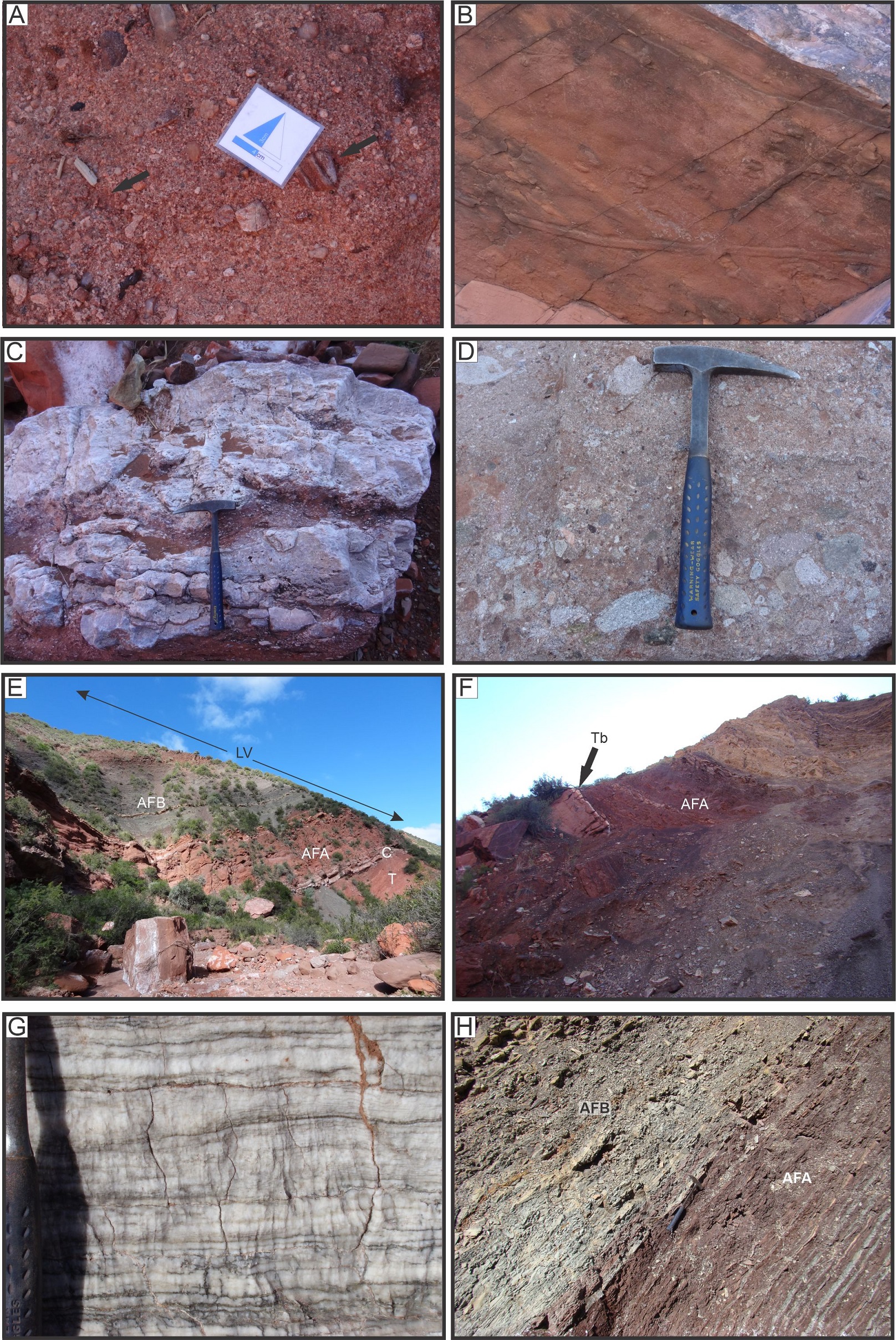 En la región aquí estudiada la Formación Talampaya está exclusivamente constituida por areniscas y fangolitas, las que forman una sucesión equivalente a las asociaciones de facies 6 y 7 descritas por Gulbranson et al. (2015) en la Cuesta de Miranda para la misma formación. Solo escasos bancos de conglomerados portan clastos de areniscas rojas, presumiblemente derivados de la subyacente Formación De La Cuesta y han sido identificados a lo largo del arroyo de La Torre (Fig. 3A). Otro rasgo de la Formación Talampaya es la presencia de huellas de tetrápodos (Melchor y De Valais, 2006), incluyendo algunas rastrilladas en la base de los bancos arenosos (Fig. 3B).
