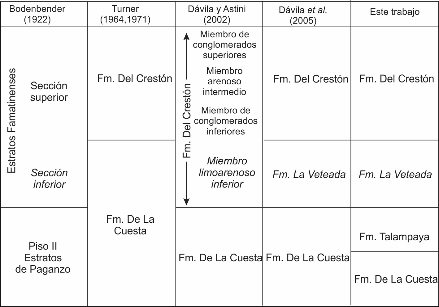 Aunque en principio Turner (1960) aceptó la división de Bodenbender (1922), una postura diferente fue adoptada por el autor años más tarde (Turner, 1964, 1971) al incluir ese intervalo de fangolitas y calizas abigarradas en la parte alta de la Formación De La Cuesta. Así, Turner incorporó “las areniscas y lutitas moradas que pasan en perfecta transición a margas y banquitos de caliza de color amarillo, con intercalaciones moradas y verdes” en el tope de la Formación De La Cuesta (Turner, 1964: p. 41), aunque sorprendentemente refirió a los niveles de yeso dentro de la suprayacente Formación Del Crestón.