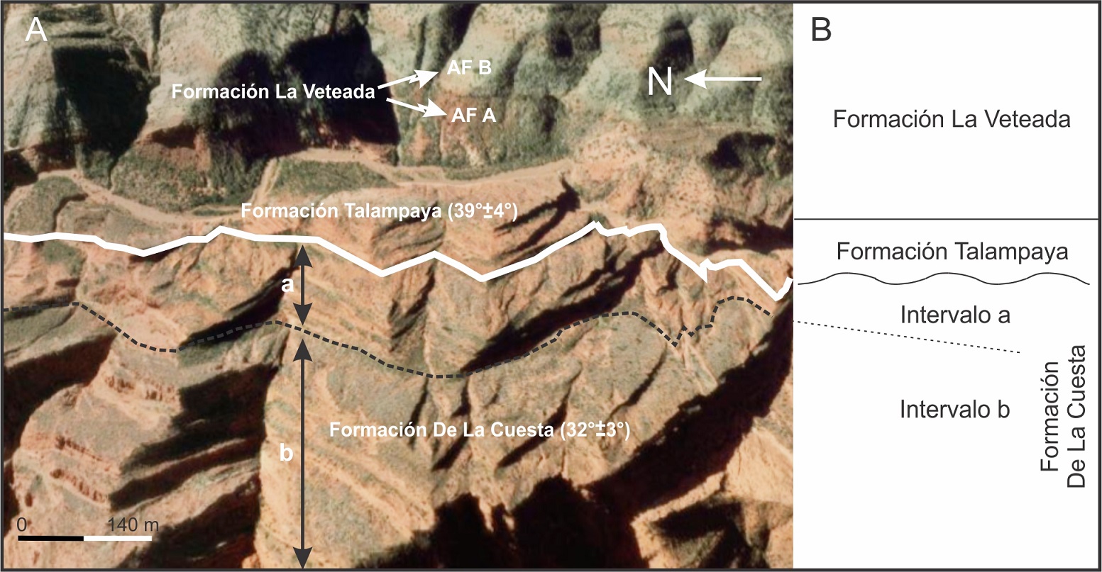 El mayor problema surge al analizar las relaciones estratigráficas basales de la Formación La Veteada. En el trabajo en el que se define la unidad se señala un contacto neto y sin rasgos de notable erosión entre las formaciones De La Cuesta y La Veteada (Dávila et al., 2005), criterio que fue seguido en contribuciones posteriores (Candiani et al., 2011). Sin embargo, años más tarde la presencia de una paraconcordancia fue sugerida por Gutiérrez et al. (2014).