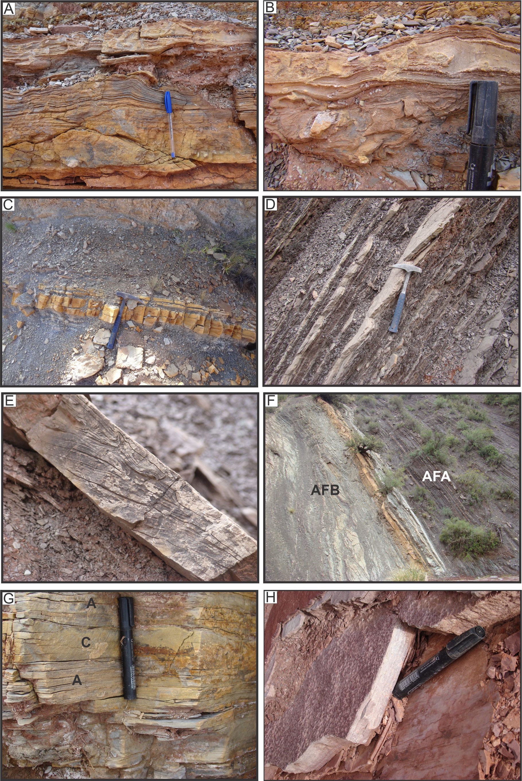 Hacia la parte media de la asociación de facies se observa un intervalo métrico de pelitas laminadas de color gris oscuro que intercala un banco de caliza gris amarillenta (Fig. 9C). Por último, las areniscas son de grano fino a muy fino, se estratifican en bancos tabulares, internamente masivos o con desarrollo imperfecto de laminación horizontal, y con menor frecuencia exhiben laminación ondulítica de corriente u oleaje bien desarrollada. Son habituales las interlaminaciones a escala milimétrica de areniscas muy finas, en ocasiones carbonáticas con delgados bancos de margas y fangolitas (Fig. 8E).