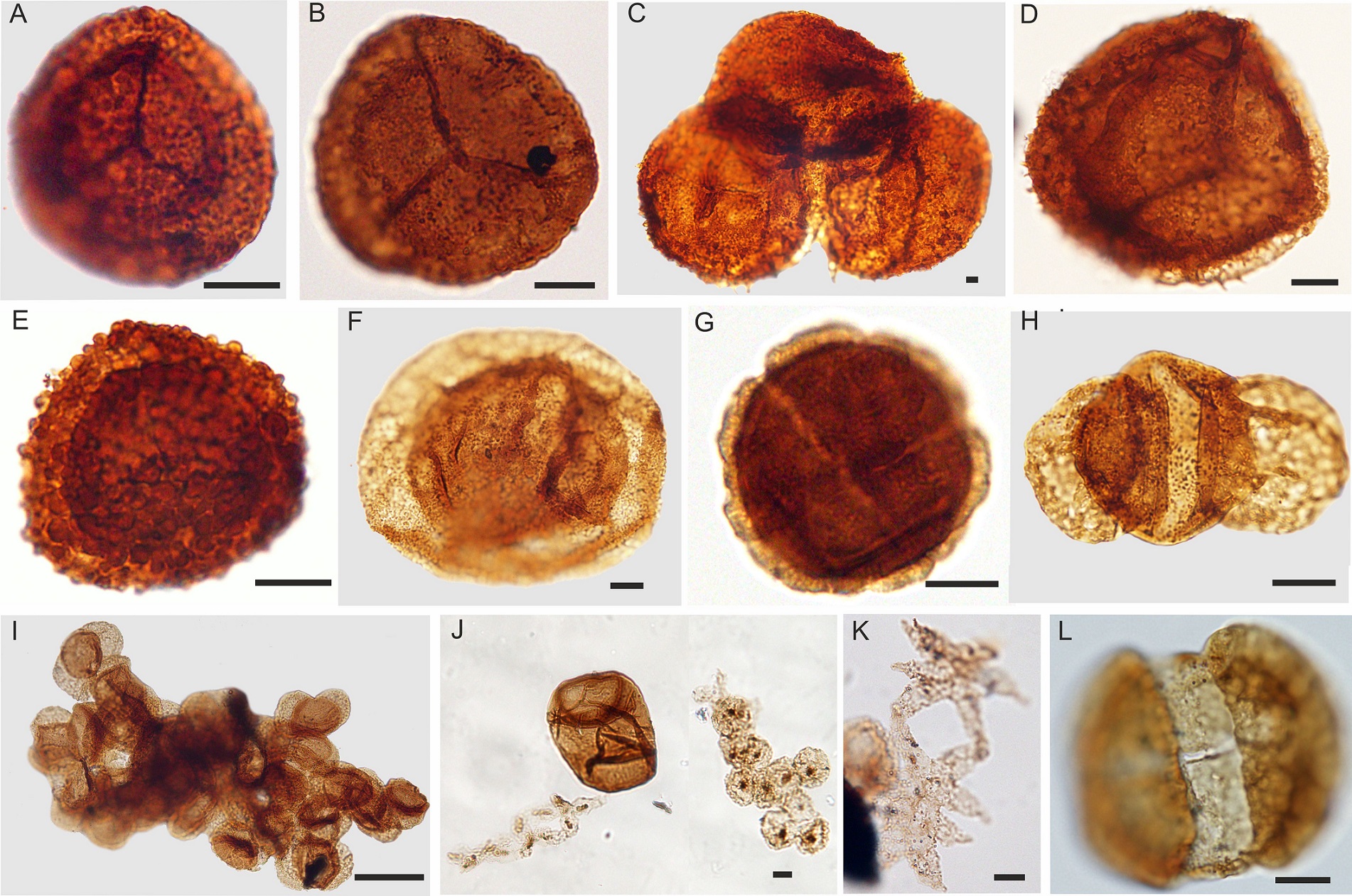 Además, se recuperaron tres asociaciones palinológicas a partir del procesamiento de muestras de rocas mediante la disolución de carbonatos y silicatos por ClH y FH respectivamente y la posterior concentración del residuo orgánico por filtrado con malla de 20 µm. Los preparados palinológicos se encuentran depositados en la Colección de Paleopalinología del Museo Argentino de Ciencias Naturales B. Rivadavia, bajo los números BA Pal 6590-6592. Los ejemplares ilustrados en esta contribución se ubican en el preparado utilizando las coordenadas England Finder.