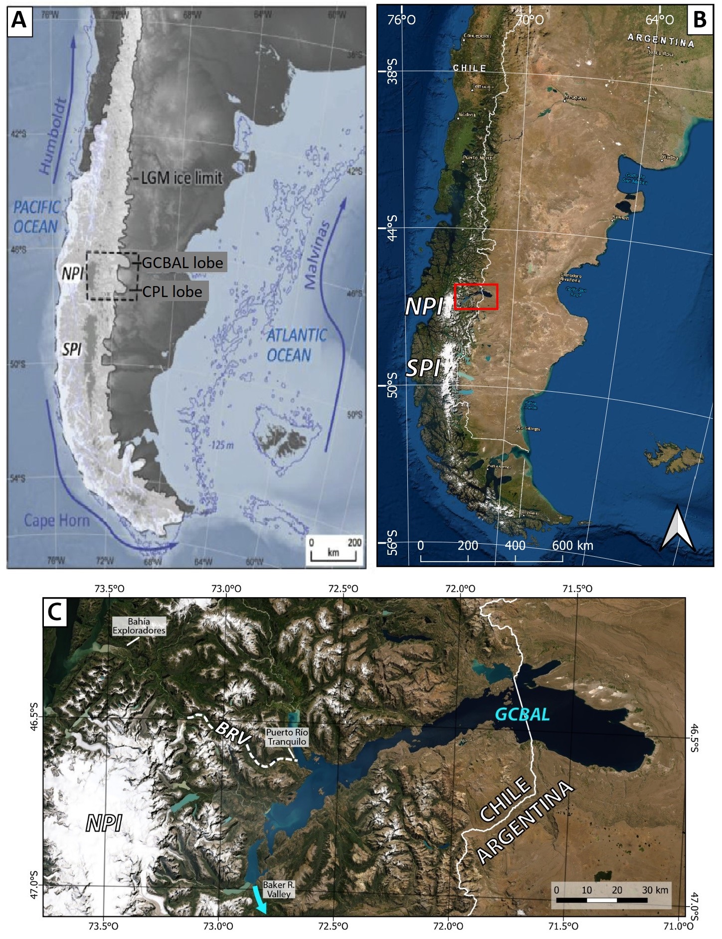 Fig. 1. A. Last Glacial Maximum (LGM) extent of the Patagonian Ice Fields from Thorndycraft et al. (2019). General Carrera-Buenos Aires Lake (GCBAL) and Cochrane-Pueyrredon Lake (CPL) lobes are located. B. Current extent of the Patagonian Ice Fields: Northern Patagonian Ice Field (NPI) and Southern Patagonian Ice Field (SPI). The General Carrera-Buenos Aires Lake area is enclosed in a red box. C. Location of General Carrera-Buenos Aires Lake, the Bayo River Valley (BRV) and its outlet on a fjord of Pacific Ocean (Bahía Exploradores).