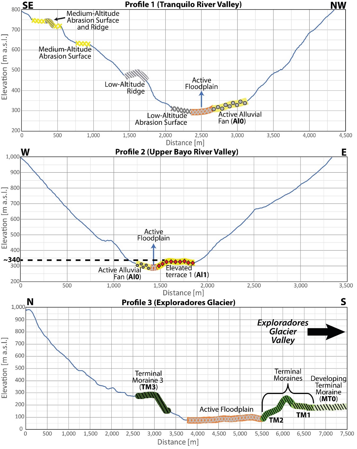 Fig. 4. Thalweg profile with average height of the most relevant landforms recognized in the Tranquilo and Bayo River valleys.