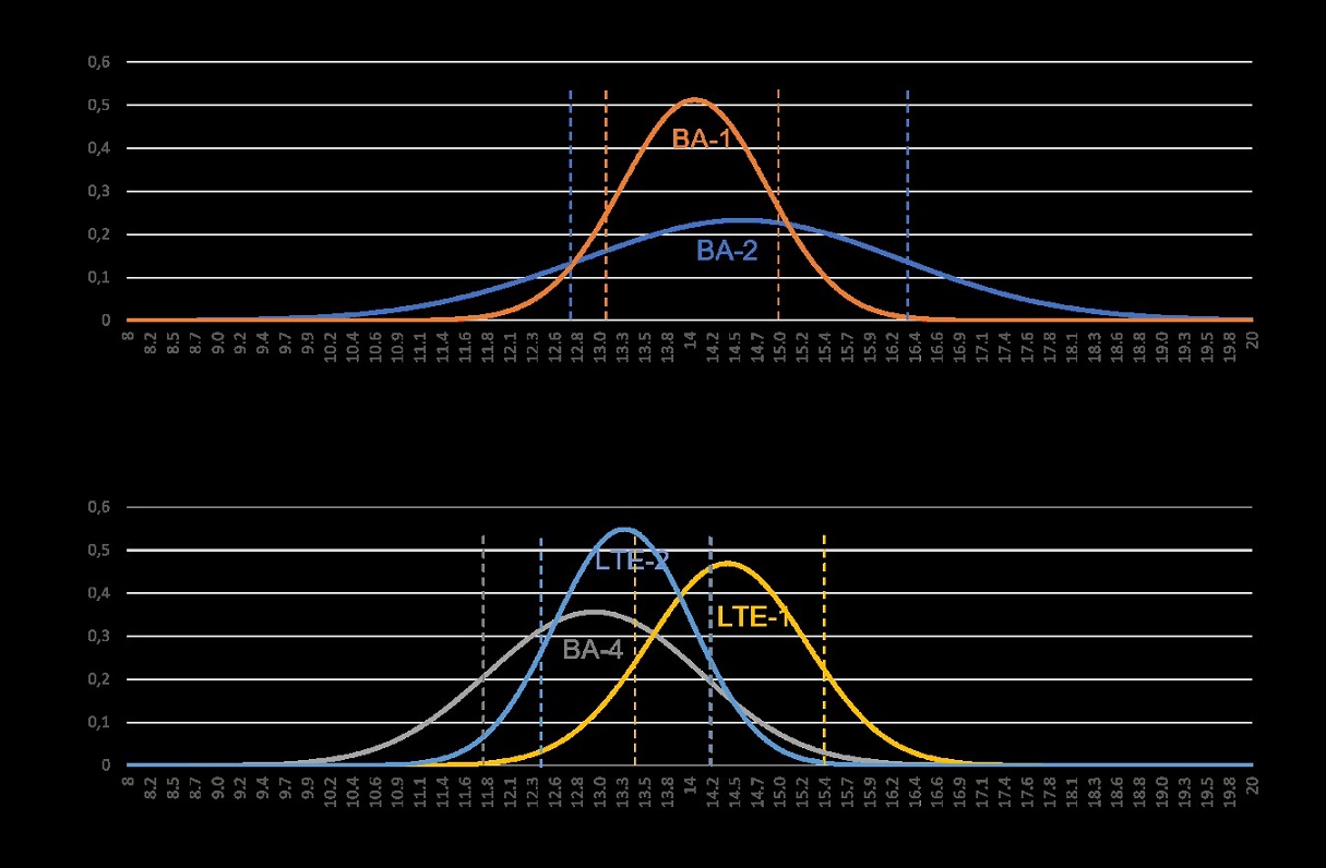 Fig. 7. Probability density function curves calculated from the exposure ages. Age of samples BA1, BA2 and BA4 obtained in this work and LT-1 and LT-2 recalibrated from data of Glasser et al. (2006). Segmented line shows 1 sigma uncertainty. A: samples in Bayo Lake area. Their 1-sigma uncertainty overlaps in the range between 13.1 ka and 15 ka. B. samples in Bayo Pass area. Their 1-sigma uncertainty overlaps in the range between 13.4 ka and 14.2 ka.