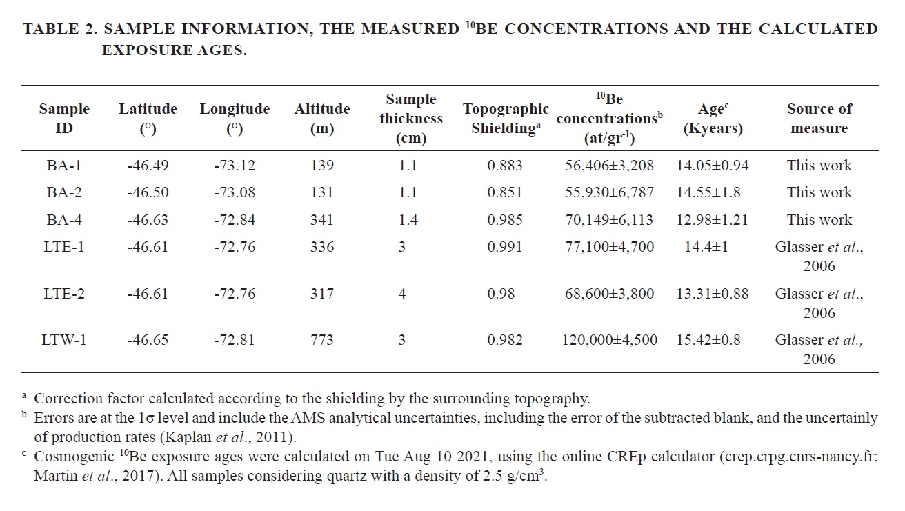 Calculation of topographic shielding was included considering the fieldwork observations. Age calculations consider an erosion rate of 0 mm/ka, as the percentage of variation per mm of erosion is only 1%, significantly less than the error associated with the 10Be measurement. Additionally, the 10Be exposure ages obtained by Glasser et al. (2006) in the Tranquilo River valley were recalculated using the same calculator.