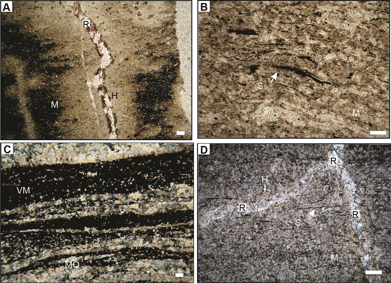 Interpretation: The well sorted vitroclasts and the dusty vitreous matrix indicates that the region was affected by ash fall. The elongated cavities described correspond to plant root systems (Alonso-Zarza and Wright, 2010; Košir, 2004), and the bleached areas of siliceous and micritic composition surrounding these radicular structures are interpreted as rizohaloes, indicating the zone of activity of the roots (Kraus and Hasiotis, 2006) with impoverishment of some element of the matrix (e.g., iron or manganese) and the disintegration of organic matter by bacterial activity (Bullock et al., 1985). The fragments of shells belong to bivalve and clam shrimp remains. The reworked particles of the tuffitic layer evidence movement of the water film.The mudcracks record desiccation episodes in a shallow subaqueous pond type environment affected by pedogenetic processes.