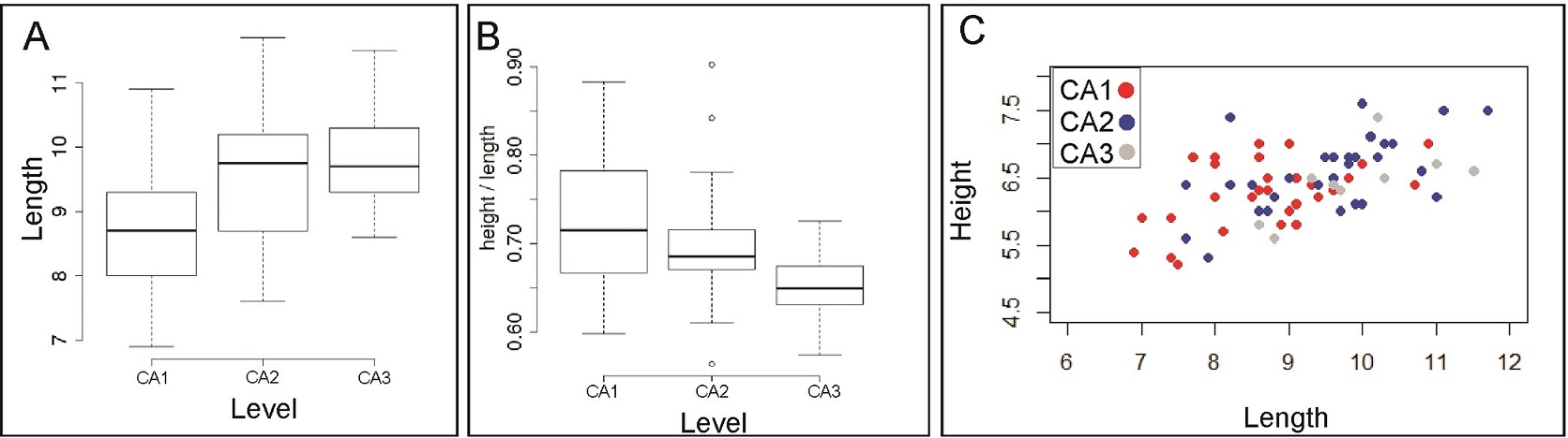 a) Shapiro-Wilk test: The null hypothesis for this test is that the data are normally distributed. The Prob <W value listed in the output is the p-value. We chosen 0.05 as alpha level and the p-value is less than 0.05, then the null hypothesis that the data are normally distributed is rejected (Royston, 1992). In this case, these results show for all levels p >0.05 for the length variable, indicating a normal distribution (Table 1). However, in CA2 level doesn’t show H/L normal distribution.