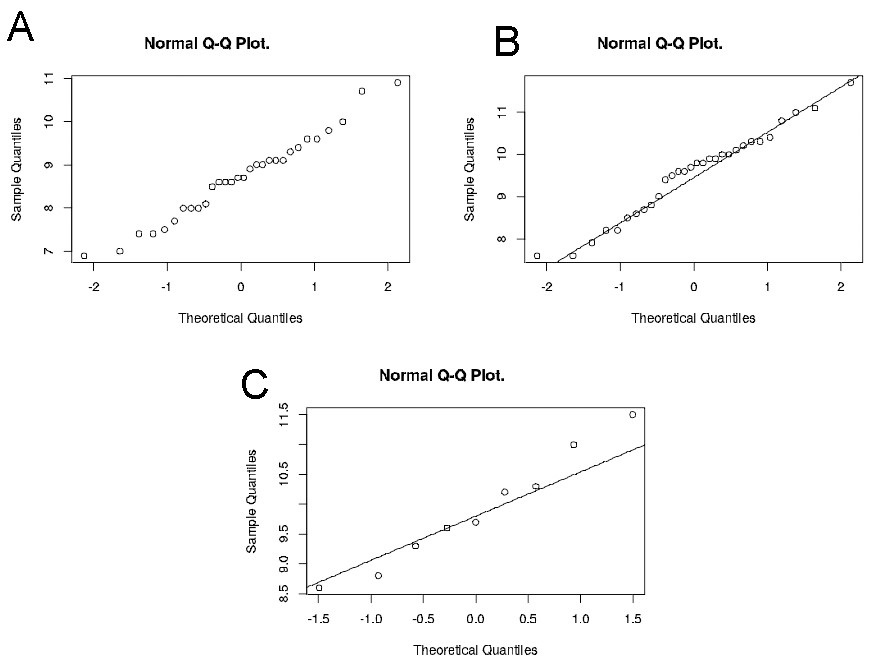 Fig. 1. Qq-plots results. A. level CA1. B. level CA2. C. level CA3.