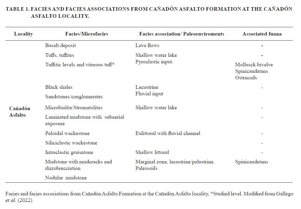 The type locality of the Las Chacritas Member is the Cerro Cóndor locality (Cerro Cóndor sub-basin). There, the member is composed by sedimentary rocks (limestone and shale) interbedded with pyroclastic deposits and basalt flows (Cabaleri and Armella, 1999). This unit ends with limestones interbedded with shales and tuffaceous levels with clam shrimps, bivalves, ostracods and coal remains. This sedimentary-volcanic sequence is interpreted as a carbonate rich lacustrine system episodically affected by intense volcanic activity developed in the margin of the Cañadón Asfalto rift basin during the synrift stage (Cabaleri et al., 2010a). These authors identified three depositional subenvironments: lacustrine, palustrine, and pedogenic. Freshwater bivalve assemblages hosted in volcanic and sedimentary rocks of the Cañadón Asfalto locality were found in tuffitic and vitreous tuff levels accumulated in a lacustrine sedimentary system with the development of microbial activity.